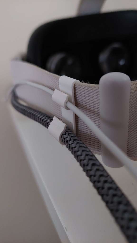 El clip está equipado con dos soportes separados: uno con un diámetro de 6,2 mm, ideal para su cable Link, y un soporte más pequeño de 3 mm, perfecto para la mayoría de los cables de auriculares. Se monta fácilmente en la correa del visor y puede permanecer allí de forma permanente. El cable se puede insertar y quitar con facilidad, incluso mientras usa su visor de realidad virtual, lo que le brinda una experiencia de juego organizada y sin esfuerzo.