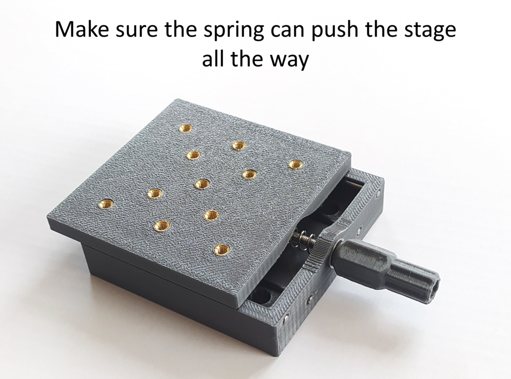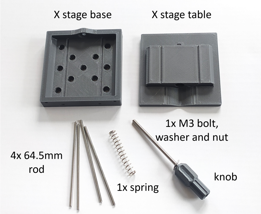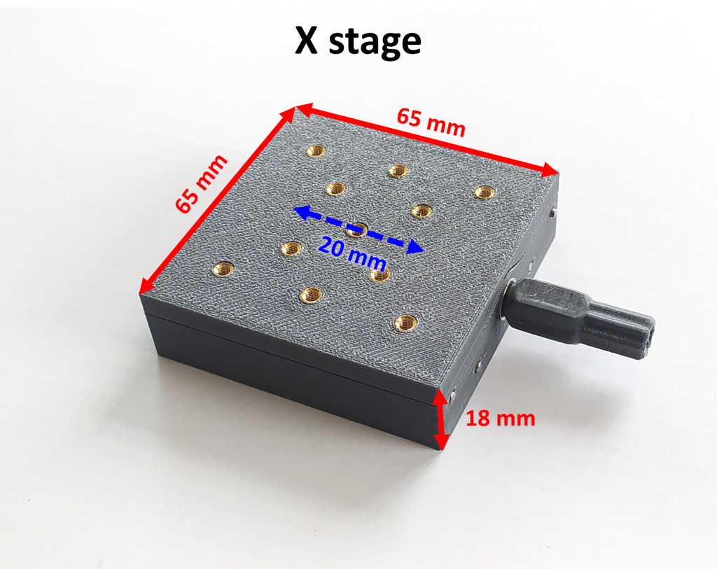 El escenario lineal impreso es una solución práctica para la posicionamiento de precisión con una exactitud de hasta 10 micrones. El diseño es ideal para proyectos donde los movimientos precisos son críticos. Utiliza piezas impresas en 3D junto con varillas de metal de 2 mm, un resorte de 40 mm y un tornillo M3 de 55 mm con tuerca y contratuerca para asegurar estabilidad y funcionalidad.