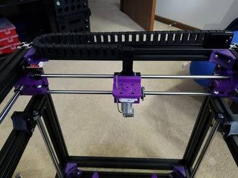 La cadena de cables montada lateralmente funciona como un soporte de cable eficaz, manteniendo todos los cables perfectamente en su lugar y creando una configuración de impresora más ordenada, una verdadera solución de ordenación de cables. Este diseño incluye tanto el carro X modificado como un soporte de montaje para fijar el otro extremo de la cadena de cables al marco de la impresora.