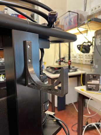 Está construido para mantener la estabilidad y mantener los cables en su lugar, incluso cuando el carro está en movimiento. La fijación se realiza de forma fácil y segura con dos tornillos de cabeza plana M3, lo que garantiza un montaje fiable. Este gancho para cables es un elemento funcional que contribuye a un espacio de trabajo más organizado y eficiente, donde los cables se mantienen perfectamente unidos y al alcance.