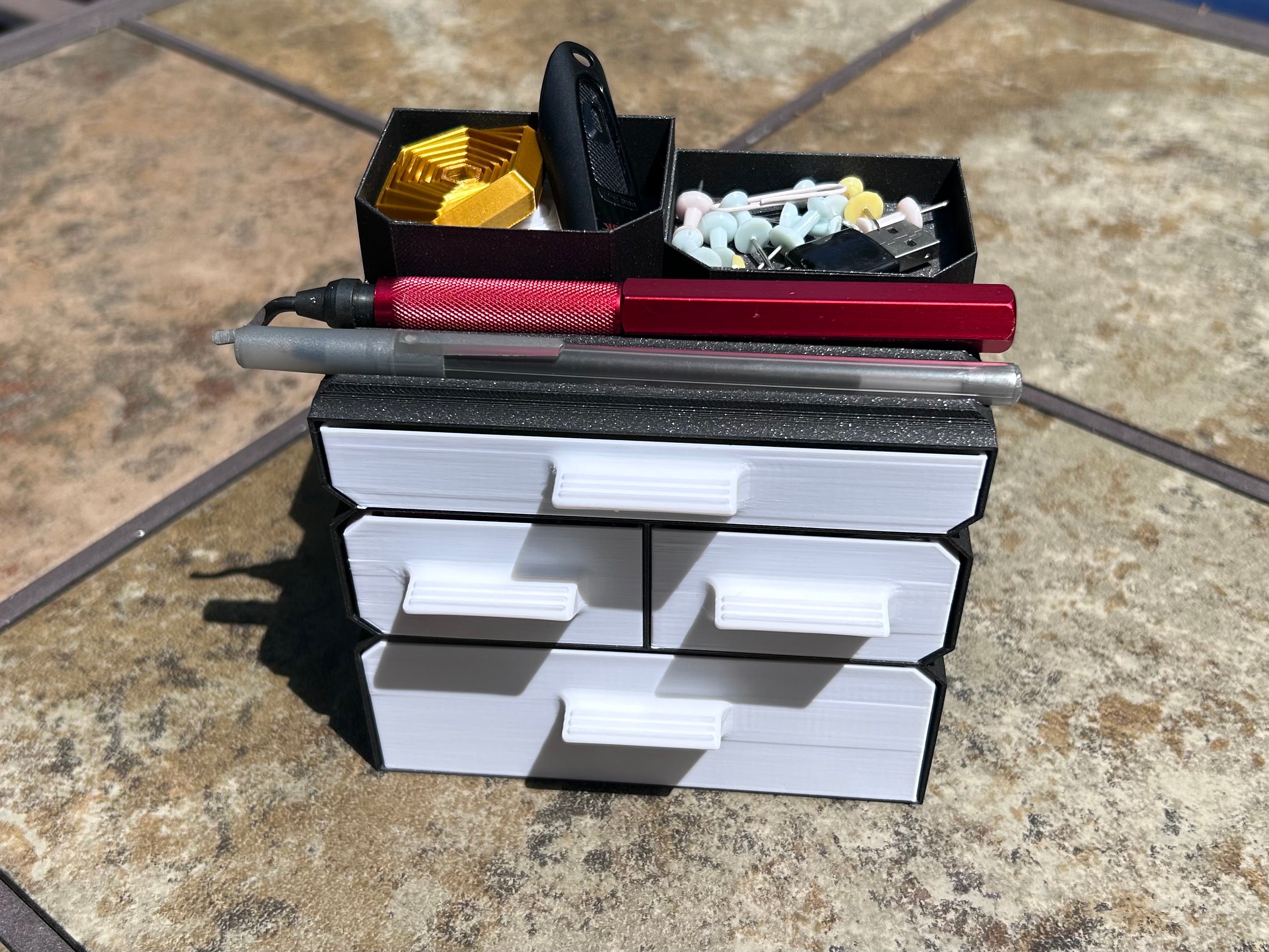 El Mini Desk Organizer es la solución ideal para el almacenamiento eficiente de tu escritorio. Con tres tamaños de cajones diferentes, puedes clasificar y organizar fácilmente pequeños objetos, desde clips hasta notas adhesivas, y los dos soportes para bolígrafos/lápices aseguran que tus utensilios de escritura siempre estén al alcance. Los dos compartimentos superiores proporcionan espacio adicional para mantener tus herramientas de oficina organizadas y al alcance.