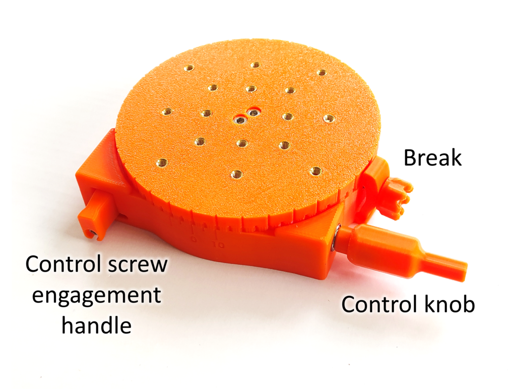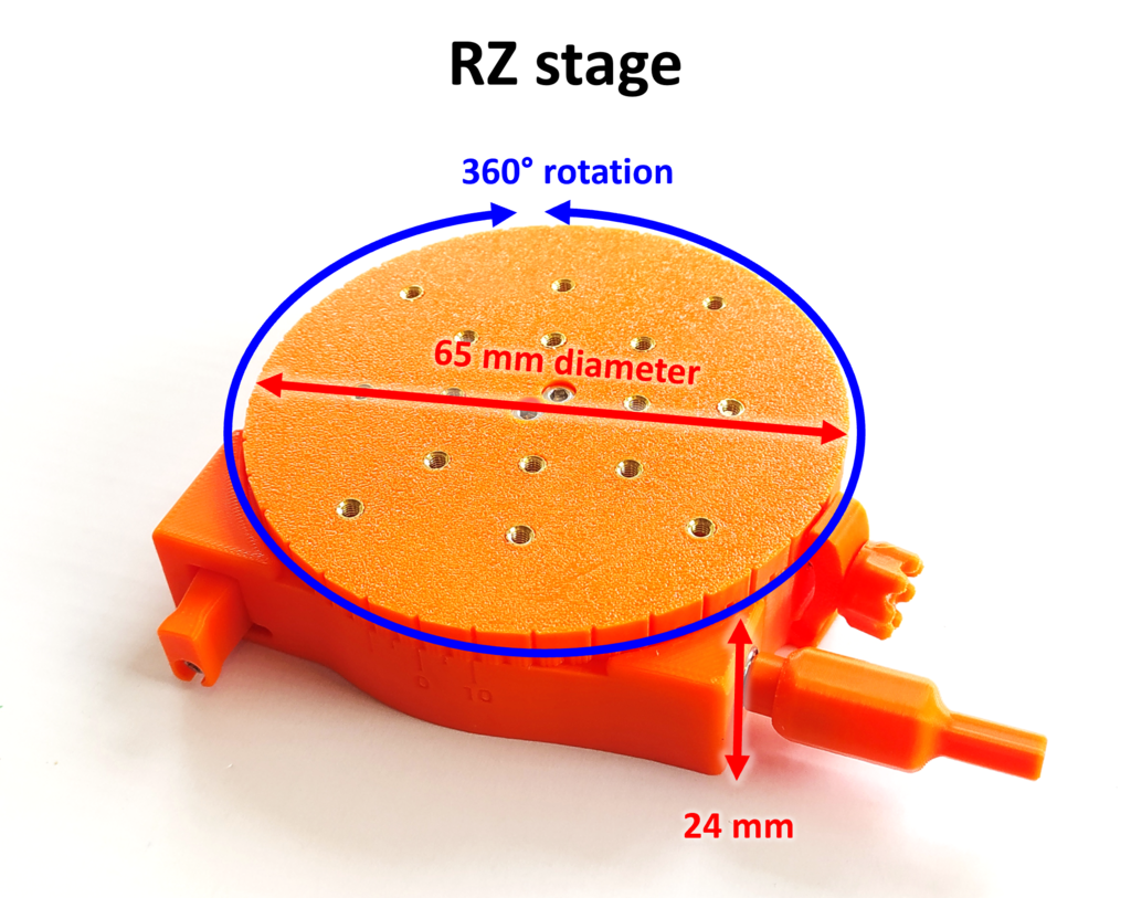 La plataforma de rotación impresa está diseñada para movimientos precisos, lo que permite una precisión de posición de hasta 10 micrones. Está compuesta de piezas impresas en 3D así como de rodamientos de bolas 6200 y MR95-zz, lo que asegura una rotación suave. La plataforma es ideal para aplicaciones donde la precisión es crucial, como la micromanipulación y el ajuste óptico.