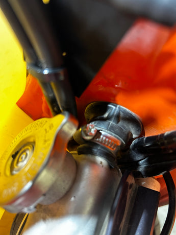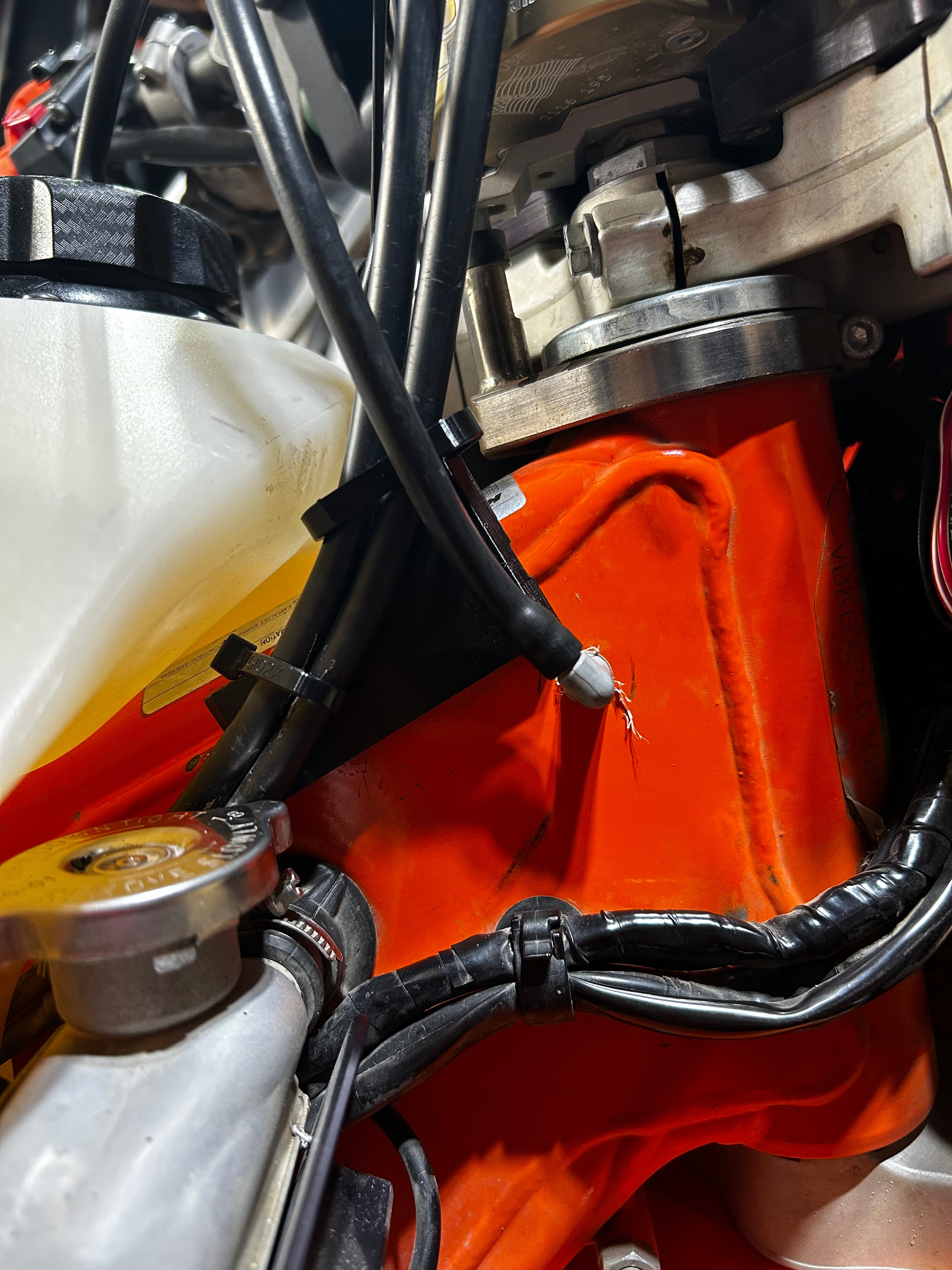 Este soporte de cable está diseñado para los modelos KTM 500 y garantiza que el cable del acelerador se mantenga seguro en su lugar. El soporte evita que los cables del acelerador entren en contacto con la manguera del radiador y el depósito de combustible, lo que elimina eficazmente el riesgo de crear marcas o rastros de desgaste en el depósito de combustible más grande.