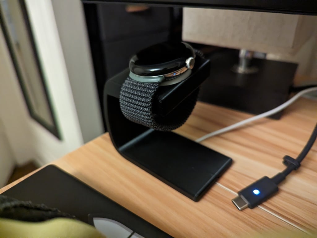 El soporte integra un espacio seguro para el cargador de inducción, y un soporte de cable integrado garantiza la gestión oculta de los cables, lo que reduce el desorden en tu mesa o mesita de noche. Esto convierte el soporte en un eficaz sujetacables. Está específicamente adaptado para alojar relojes con correas elásticas, pero su diseño garantiza que funcione de forma óptima con todos los tipos de correas del Pixel Watch.