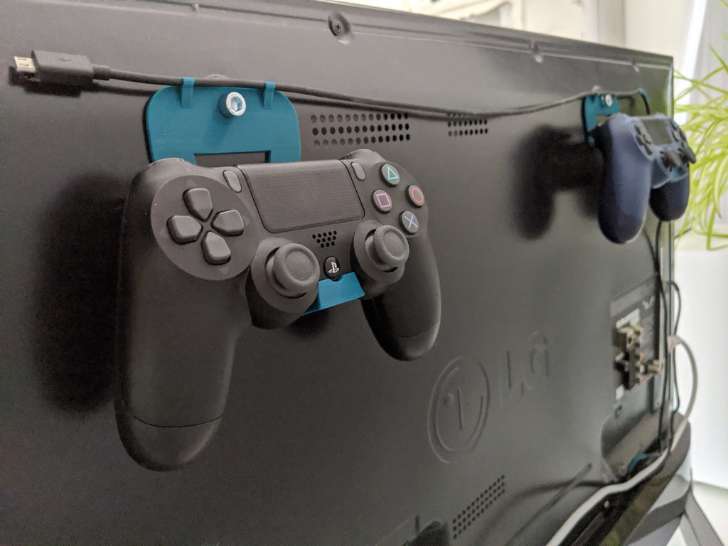 Este soporte para controlador está diseñado para brindar una solución de almacenamiento práctica y discreta para su controlador de PlayStation 4. El soporte está diseñado para montarse en la parte posterior de su televisor, donde utiliza los puntos de montaje en pared existentes del televisor con un solo orificio para tornillo. Esta ubicación mantiene su controlador fuera de la vista, pero aún así es fácilmente accesible. Una de las ventajas de esta ubicación es la posibilidad de cargar el controlador directamente a través de uno de los puertos USB del televisor cuando está encendido. Para garantizar una configuración organizada, el soporte está equipado con dos sujetacables integrados que funcionan eficazmente como un soporte para cables y un sujetacables discretos para su cable USB, lo que contribuye a un área de entretenimiento limpia y ordenada.