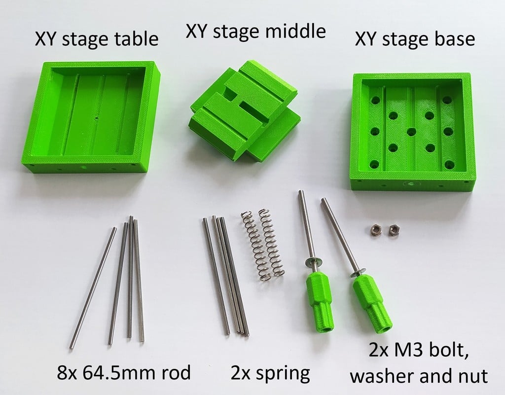 El escenario lineal de dos ejes ofrece una impresionante precisión de posicionamiento de aproximadamente 10 micrómetros. Esta estructura robusta, que combina piezas impresas en 3D con varillas de metal de 2 mm y dos resortes, destaca un diseño eficiente que se puede utilizar en varios proyectos de precisión.