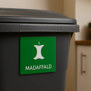 Producido en plástico PLA con un icono y texto claros que siguen el sistema de clasificación danés.