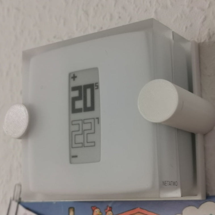 Soporte de pared simple para termostato Netatmo que sujeta el termostato para que sea posible ajustar la temperatura. La versión inferior tiene 2 mm menos de espacio en profundidad, por lo que encaja con total precisión.