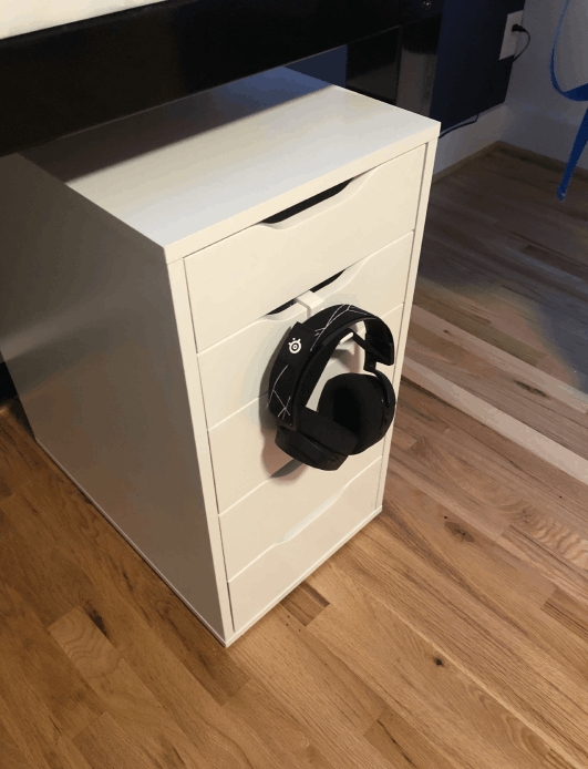 Este colgador plegable para auriculares es una solución práctica para mantener ordenado su escritorio o espacio de trabajo. Está diseñado para encajar perfectamente en los módulos de cajones Ikea Alex, pero también se puede montar fácilmente en otras superficies con un grosor de hasta 16 mm, como estantes de madera.