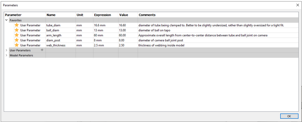 El modelo es totalmente escalable, por lo que puedes ajustar fácilmente las dimensiones principales en Fusion360 si tienes otro tamaño de marco/tubo o un tamaño diferente de rótula + zócalo en tu cámara.