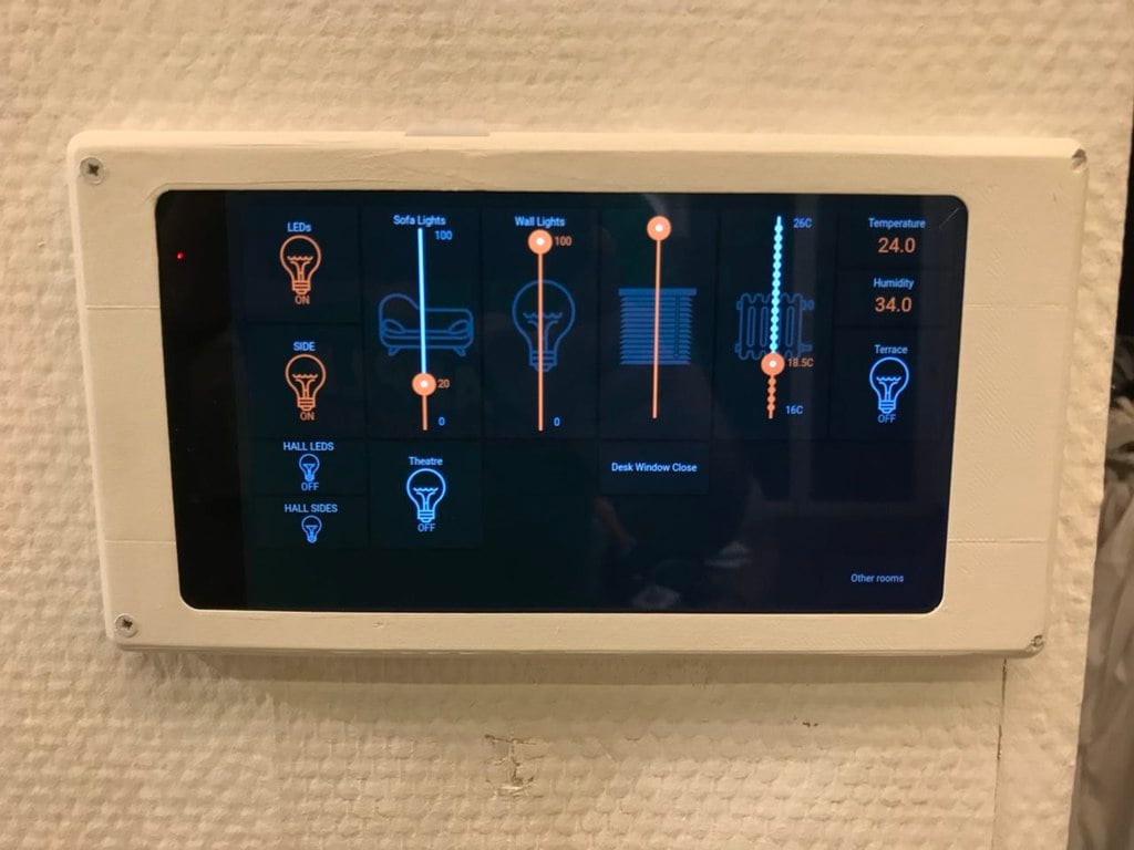 Este soporte de pared está diseñado para una tableta Lenovo Tab7 Essentials de 7", específicamente para el modelo TB-7304F. Incluye espacio para un microUSB en el interior y permite utilizar la tableta como mando a distancia inteligente para el hogar. Se puede acceder fácilmente al botón de encendido en la parte superior para cualquier reinicio o para activar la tableta.