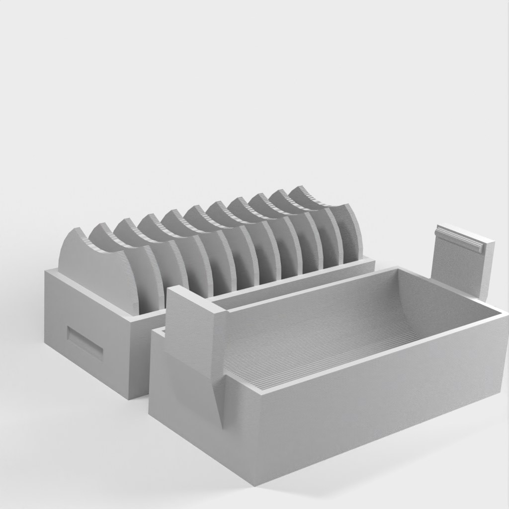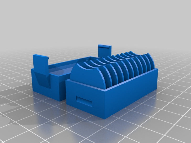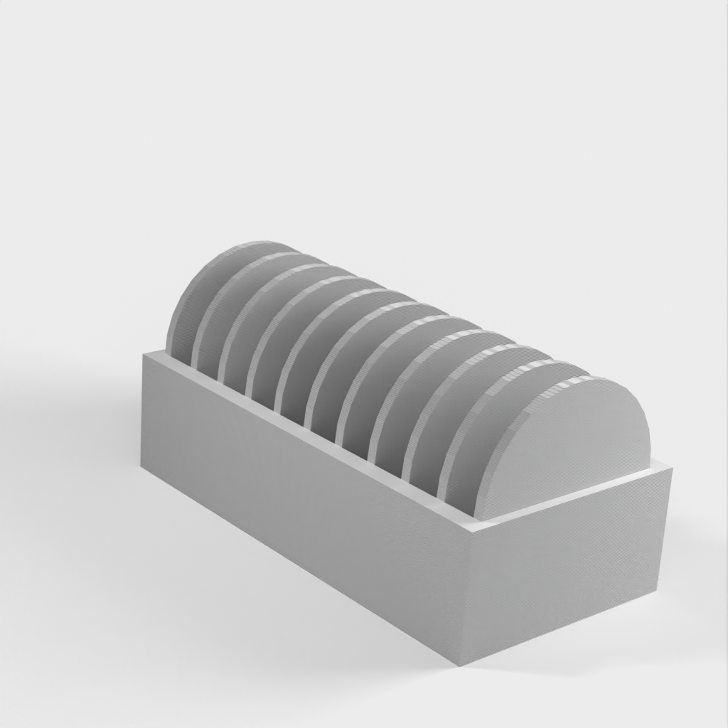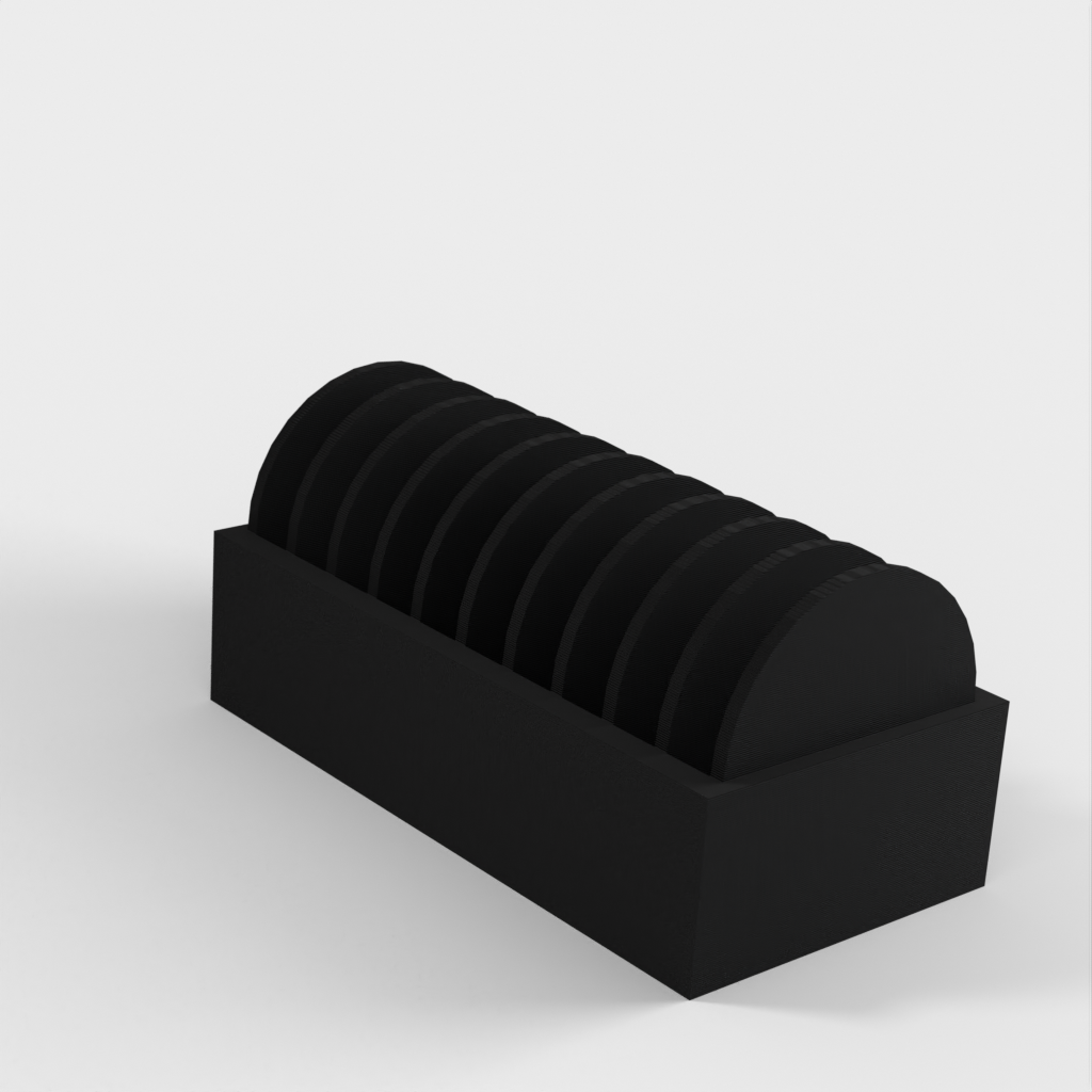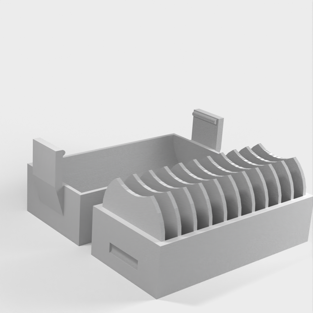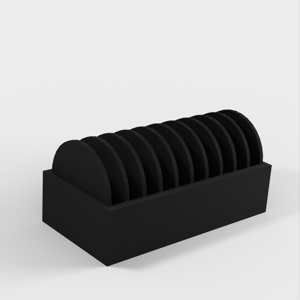 Un pequeño soporte para 10 pilas de botón CR2032. Se ha añadido una nueva versión con tapa que permite introducir y extraer las pilas más fácilmente. La tapa tiene un clip para mantener las pilas en su sitio si se cae.