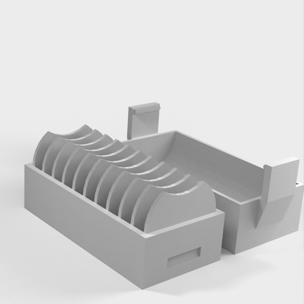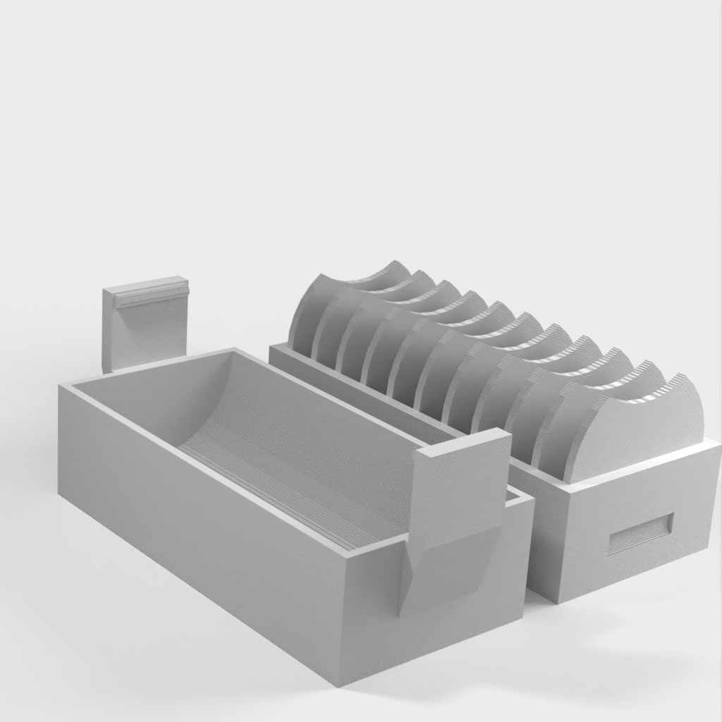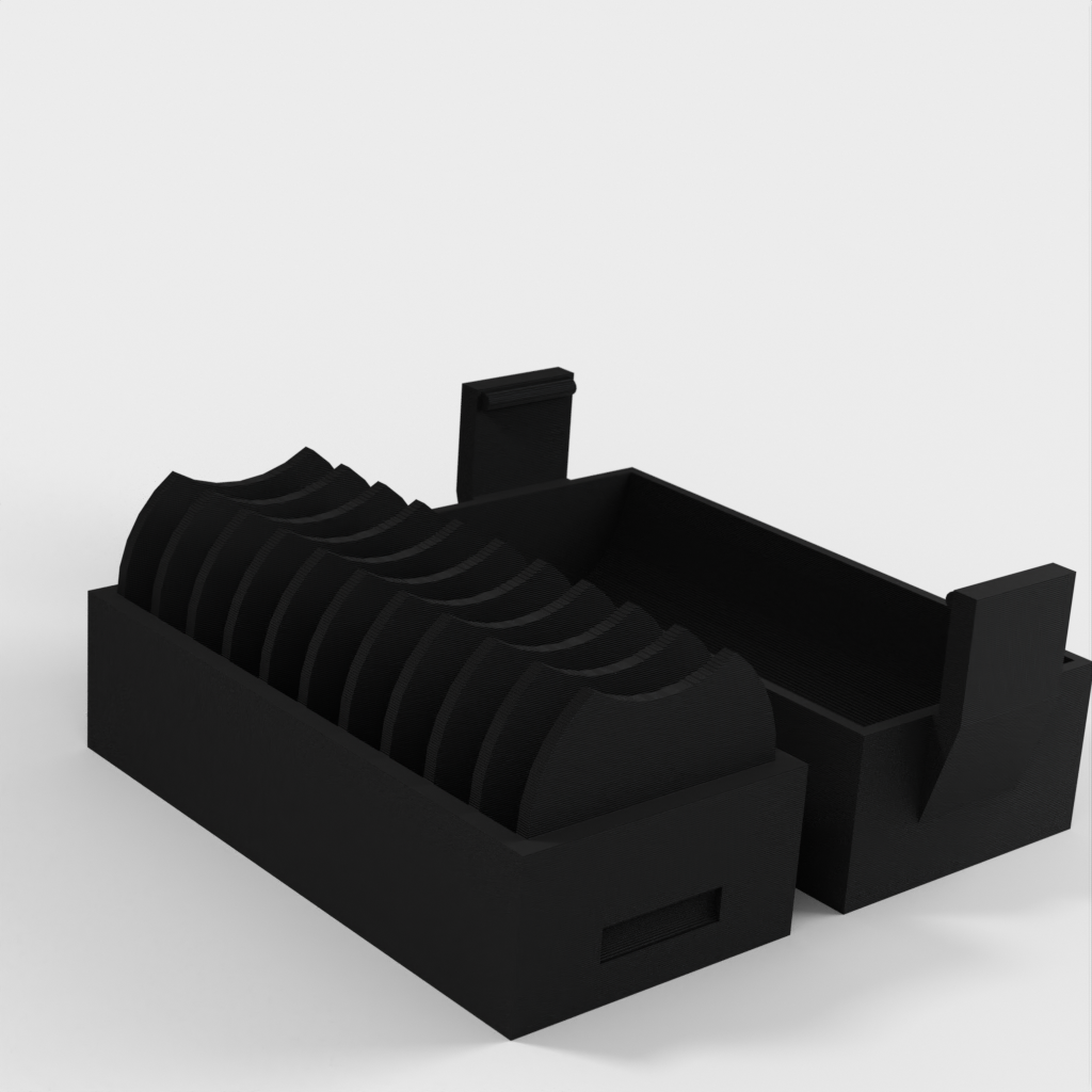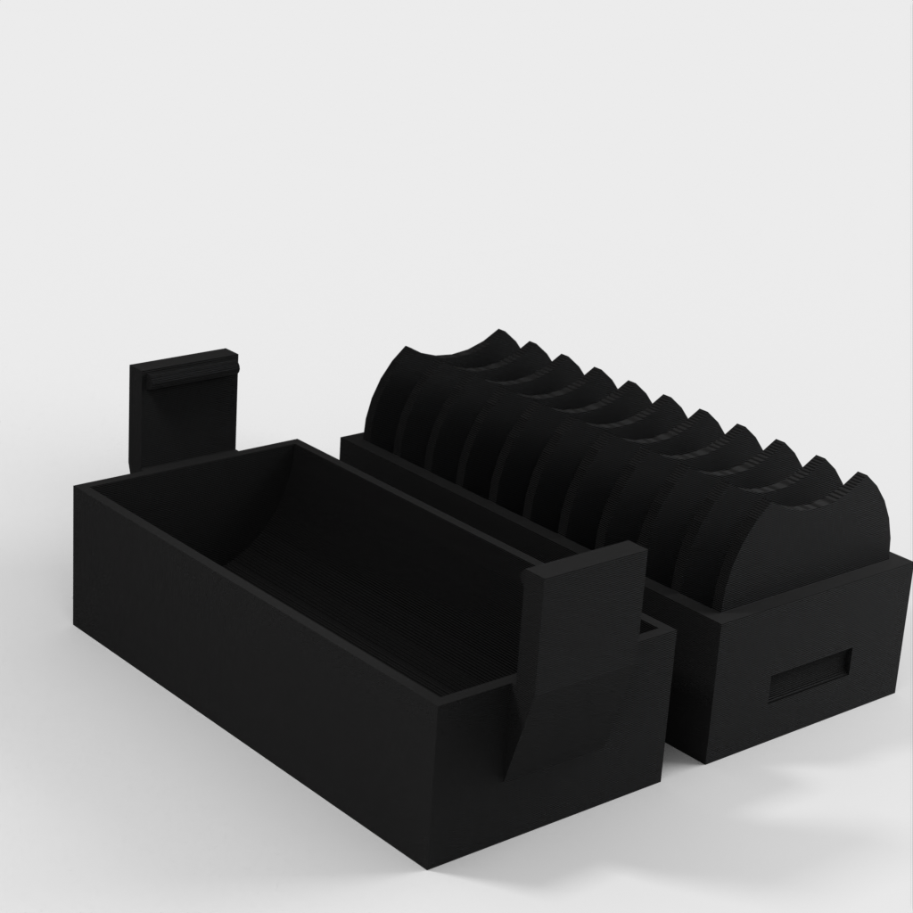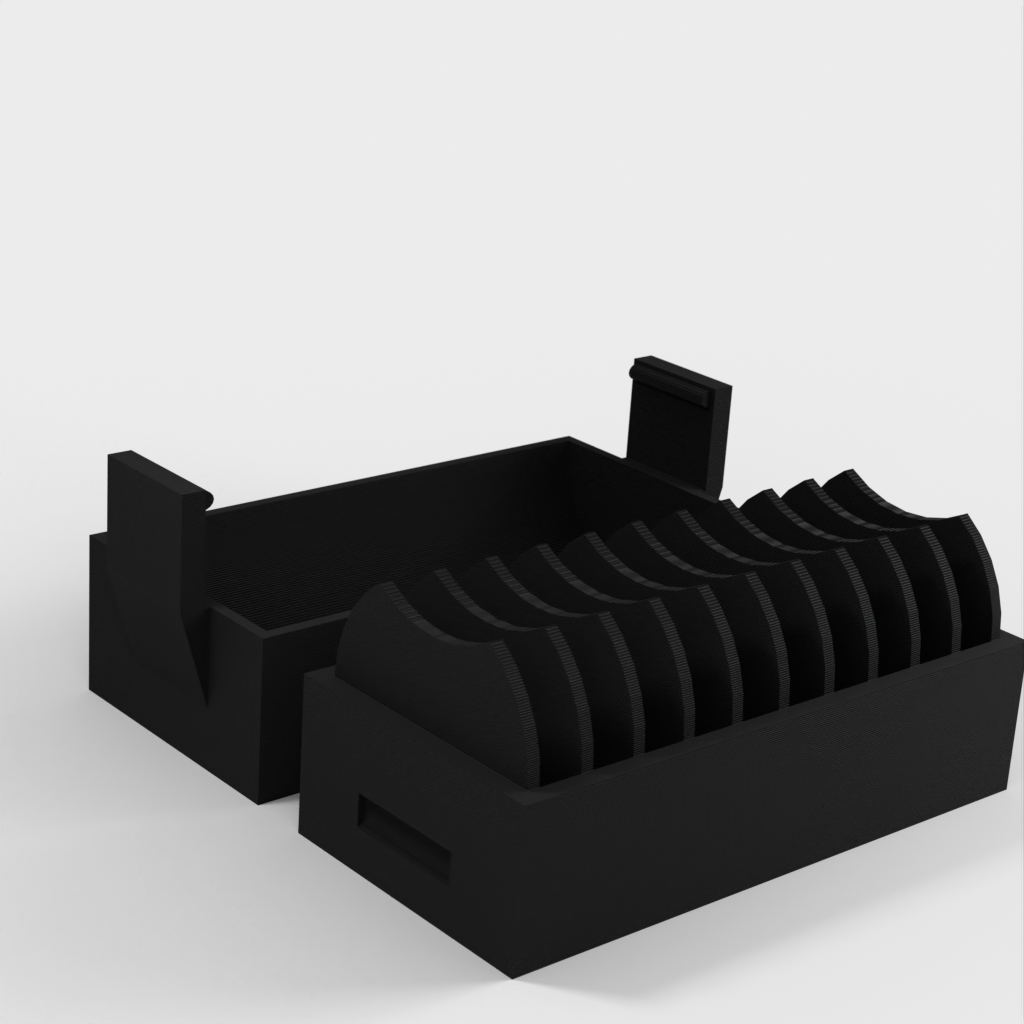 Un pequeño soporte para 10 pilas de botón CR2032. Se ha añadido una nueva versión con tapa que permite introducir y extraer las pilas más fácilmente. La tapa tiene un clip para mantener las pilas en su sitio si se cae.