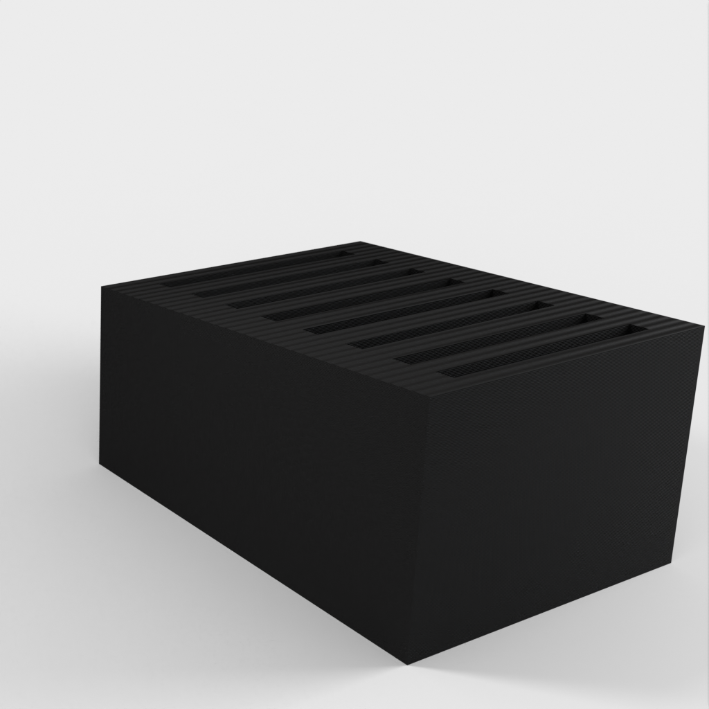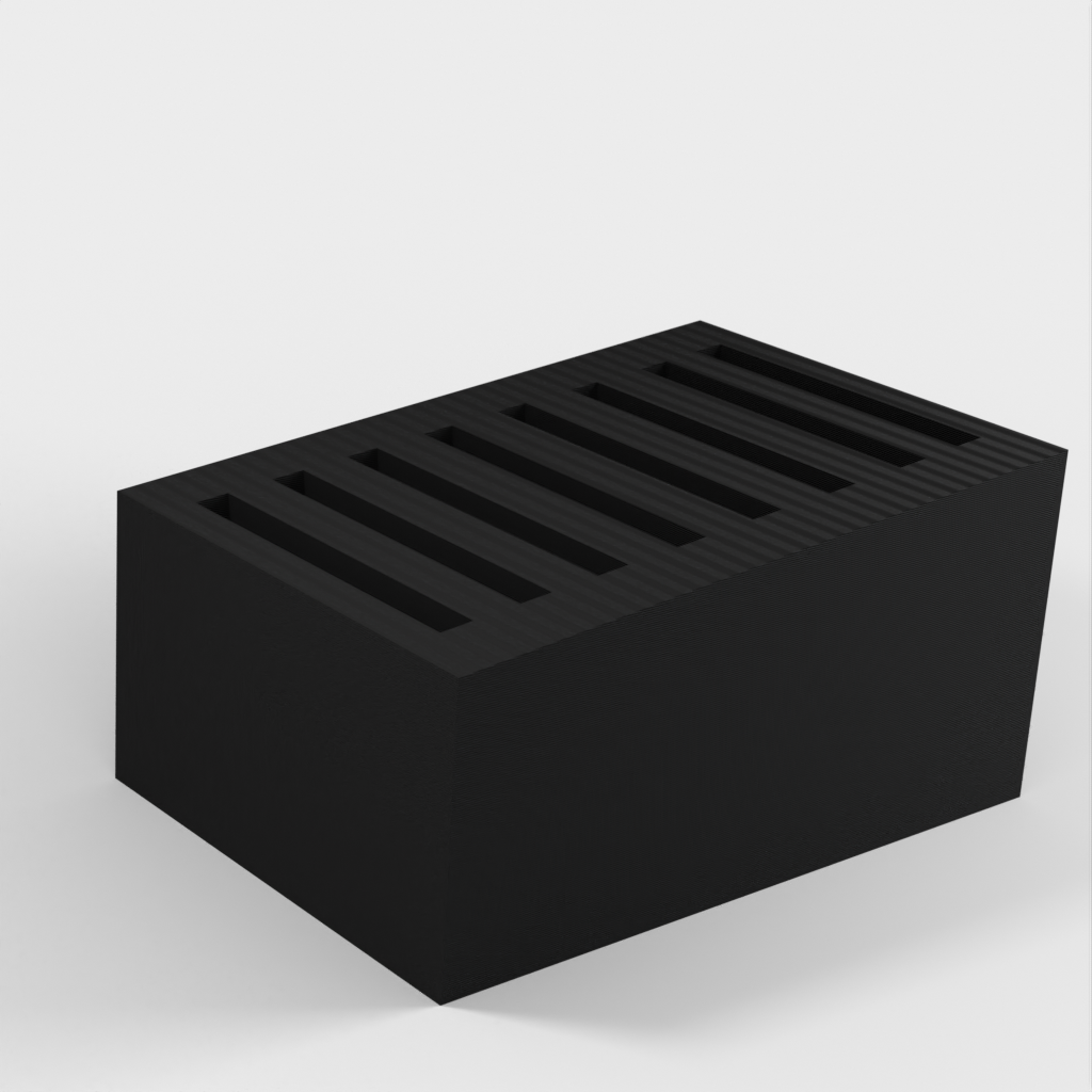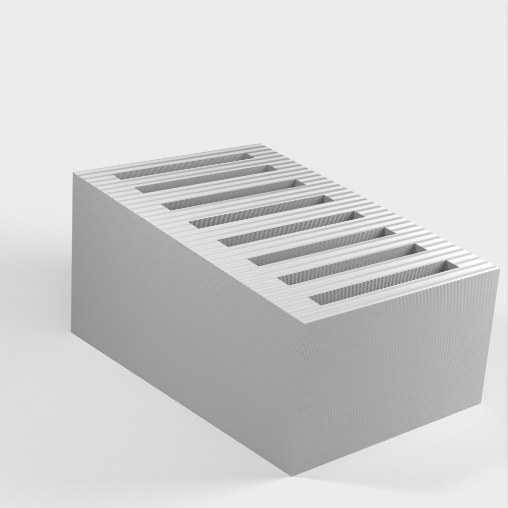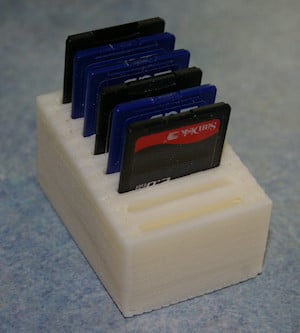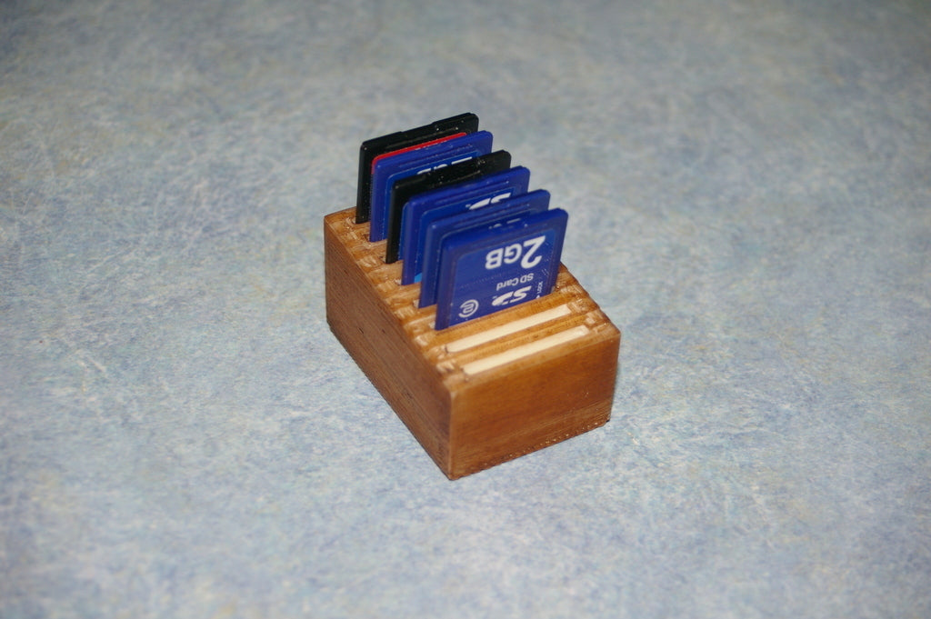 Este es un sencillo soporte para tarjetas SD que puede contener hasta 8 tarjetas SD. Las ranuras están ligeramente apretadas para evitar que las tarjetas se caigan si se golpea el soporte. Además, el soporte de la tarjeta SD tiene un diseño muy simple.