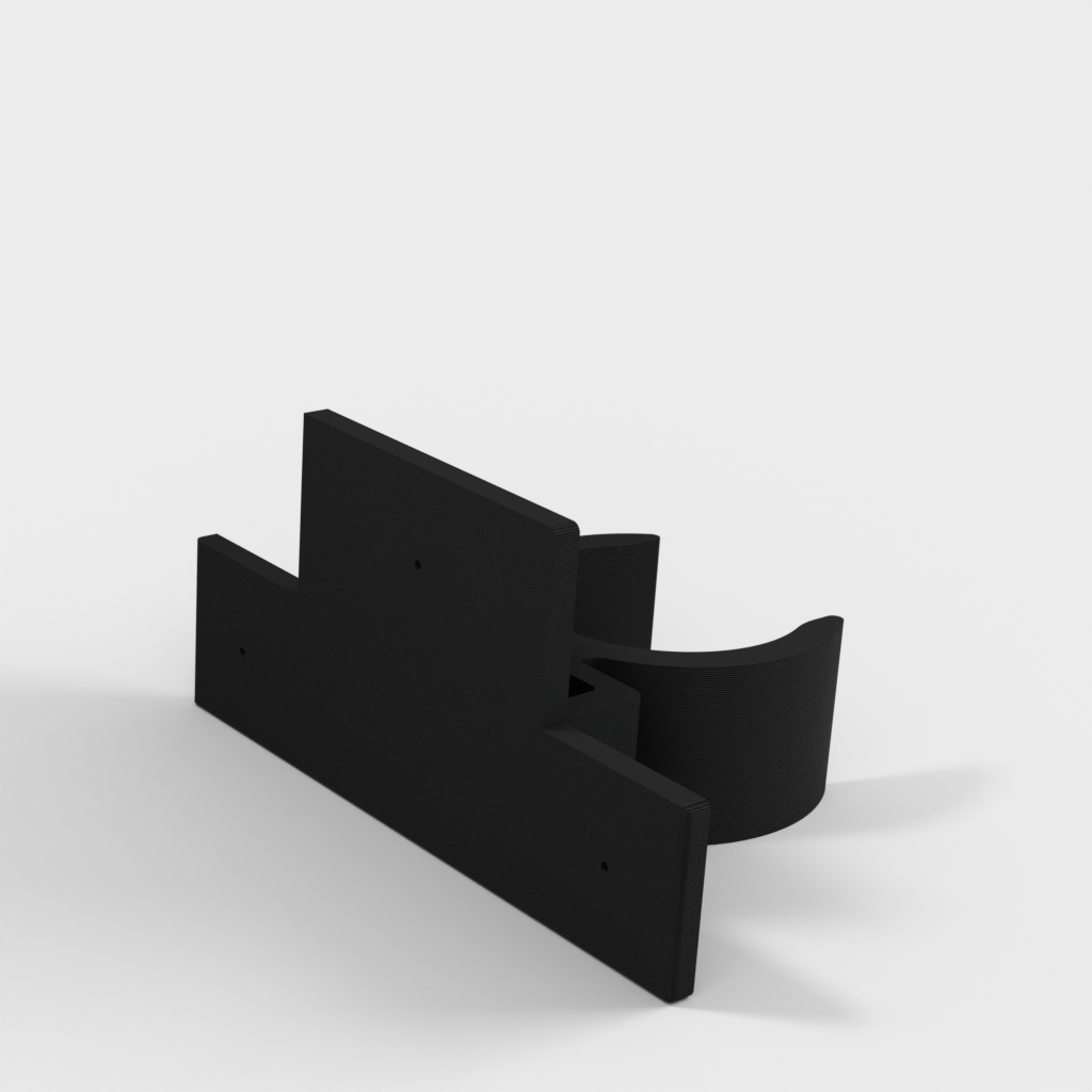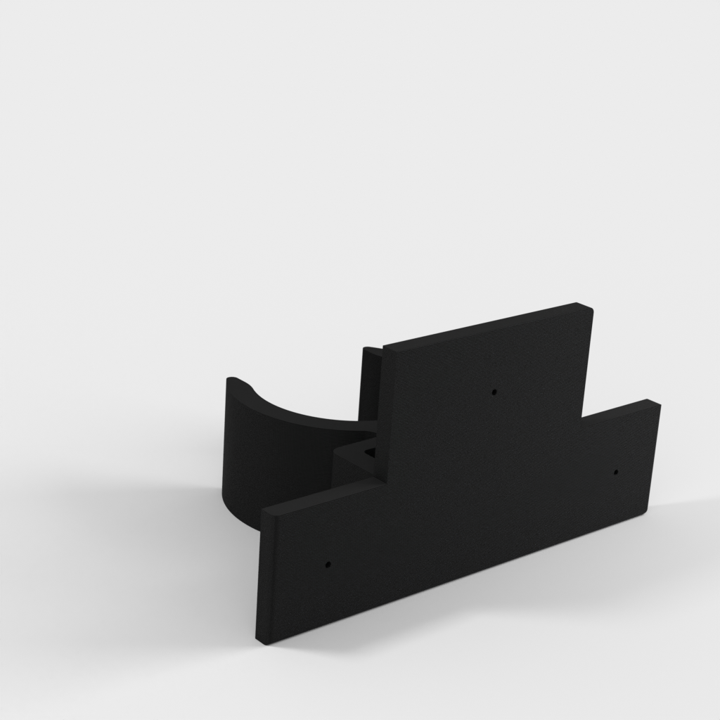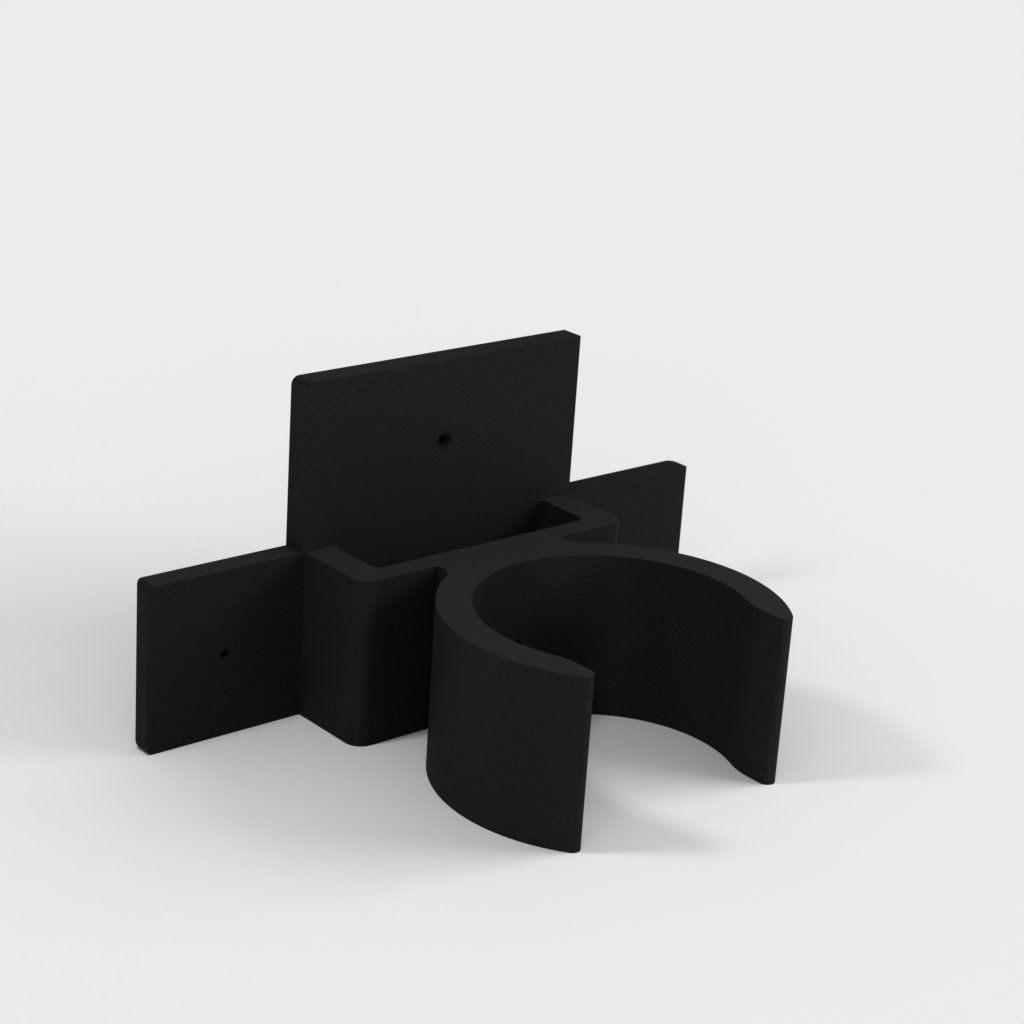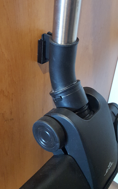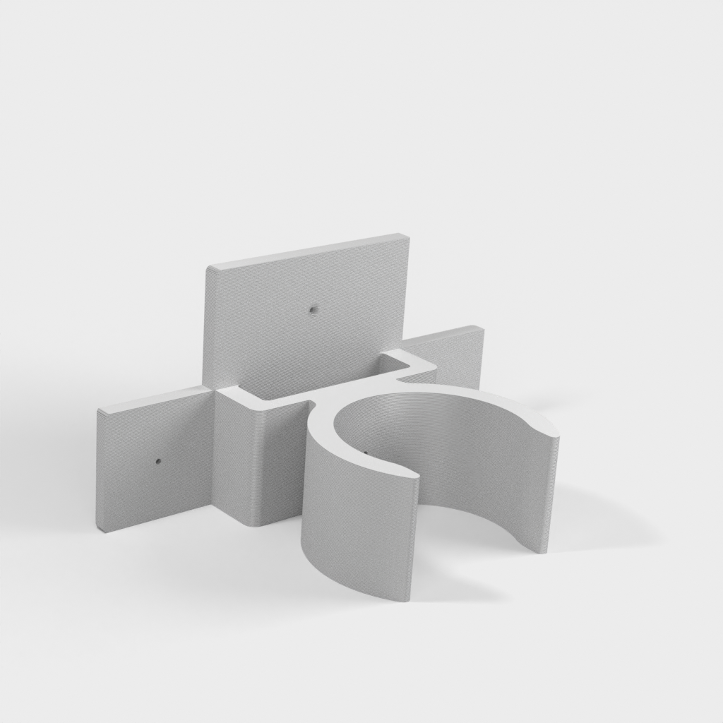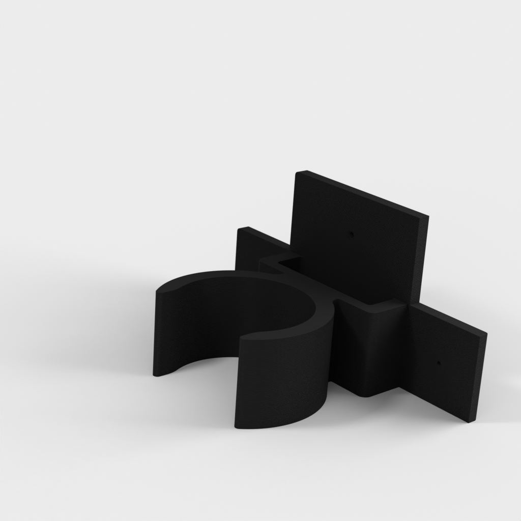 Soporte para tubos de aspiradora ETA Stellar. La parte inferior soporta las partes en forma de T del tubo y se recomienda fijarla con tornillos, ya que soporta la mayor parte del peso. La parte superior está diseñada para tubos con un diámetro de 32 mm, sin embargo, también se puede utilizar para piezas de 35 mm sin ningún problema. Esta parte se puede fijar con un tornillo o con cinta adhesiva de doble cara.
