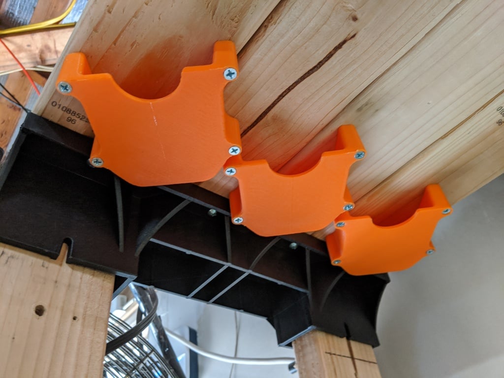 Esta es una percha simple para herramientas aéreas de Ryobi, diseñada para montar sus herramientas inalámbricas Ryobi de 18 V en el techo de su taller o garaje. Cualquier barra de peso se puede asegurar fácilmente con cuatro tornillos para madera #8 x 2 pulgadas.