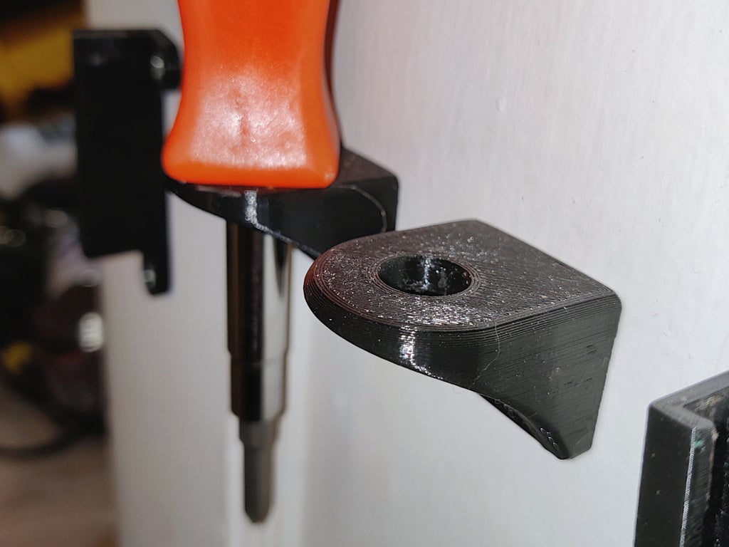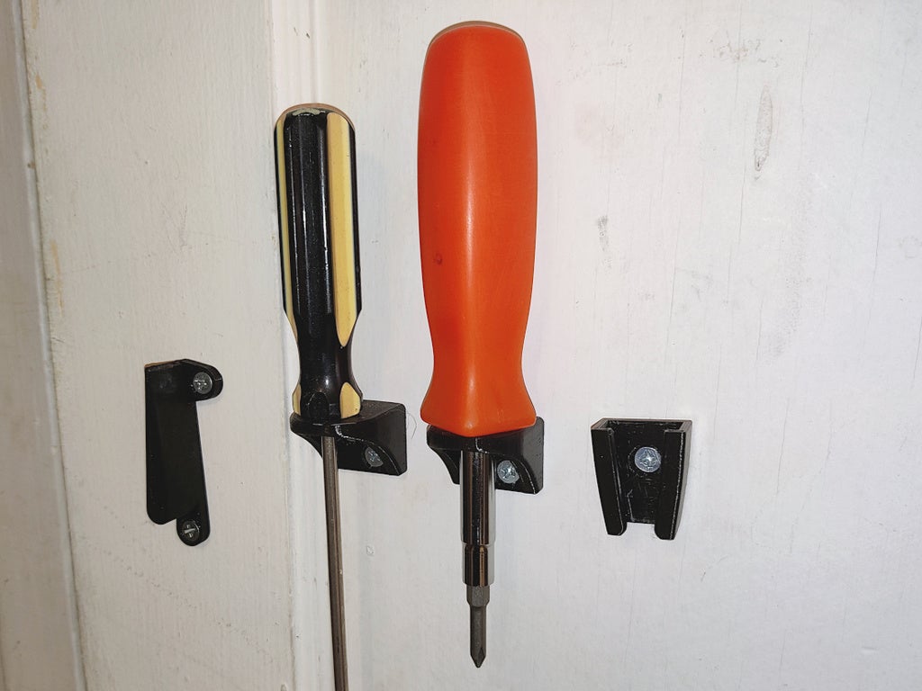 Este es un simple soporte de pared para destornilladores. Se puede montar con dos tornillos avellanados #8 o #6. No se necesitan soportes.