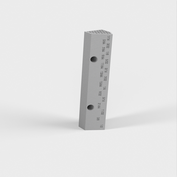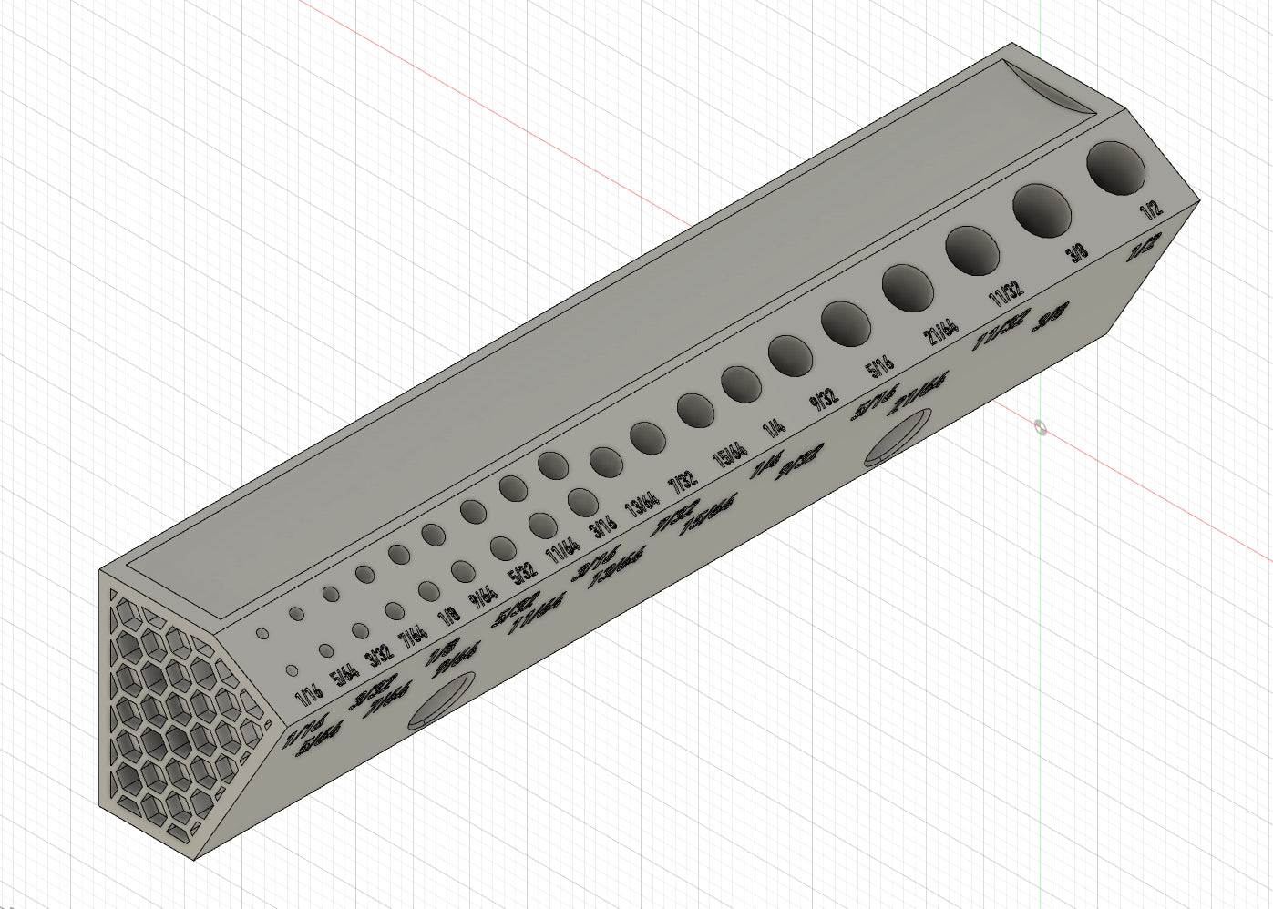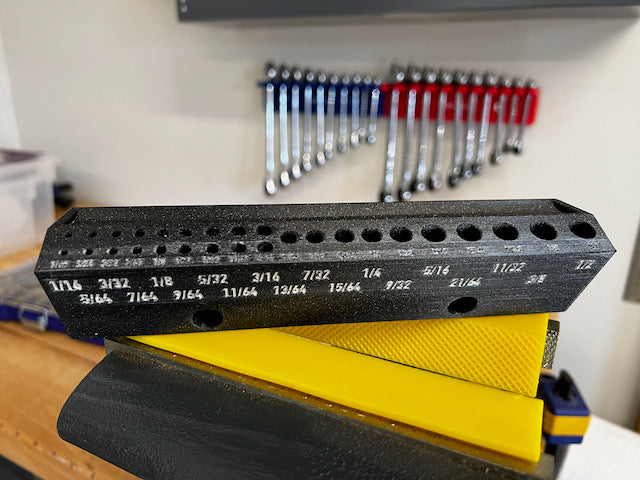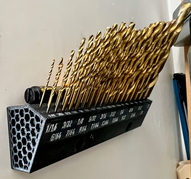 Este es un porta brocas compacto, montado en la pared, para brocas de tamaños de 1/16' a 1/2' en incrementos de 1/64'. El soporte mide 8' de longitud y sujeta las brocas en un ángulo de 30º para un acceso rápido y fácil. Para tamaños de broca más pequeños (de 1/16' a 3/16'), hay dos ranuras para que pueda tener una broca adicional cerca en caso de que se rompa una. Detrás de las brocas hay una bandeja empotrada para guardar bolígrafos, lápices o incluso brocas adicionales que utilice durante un proyecto.