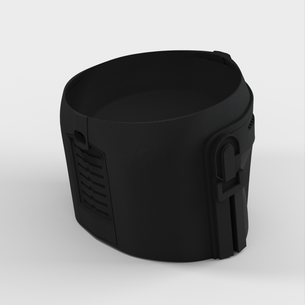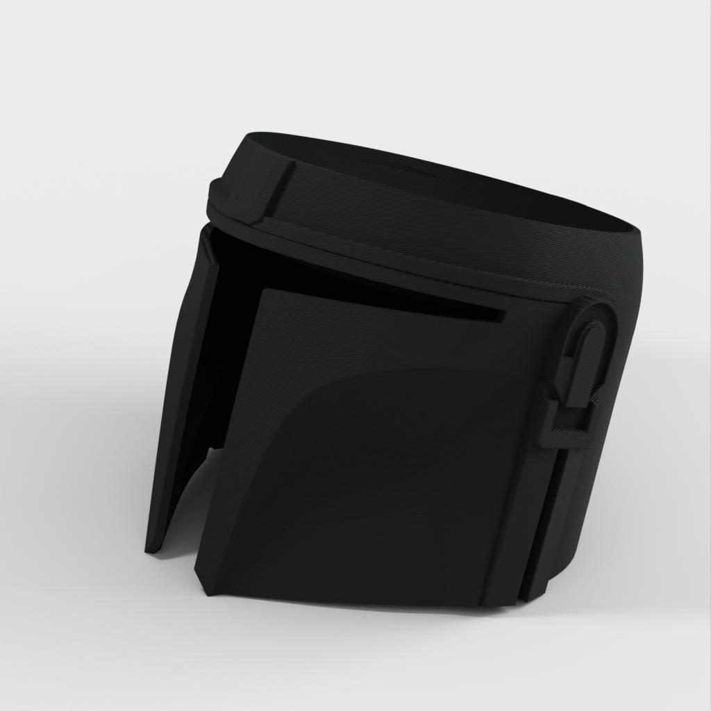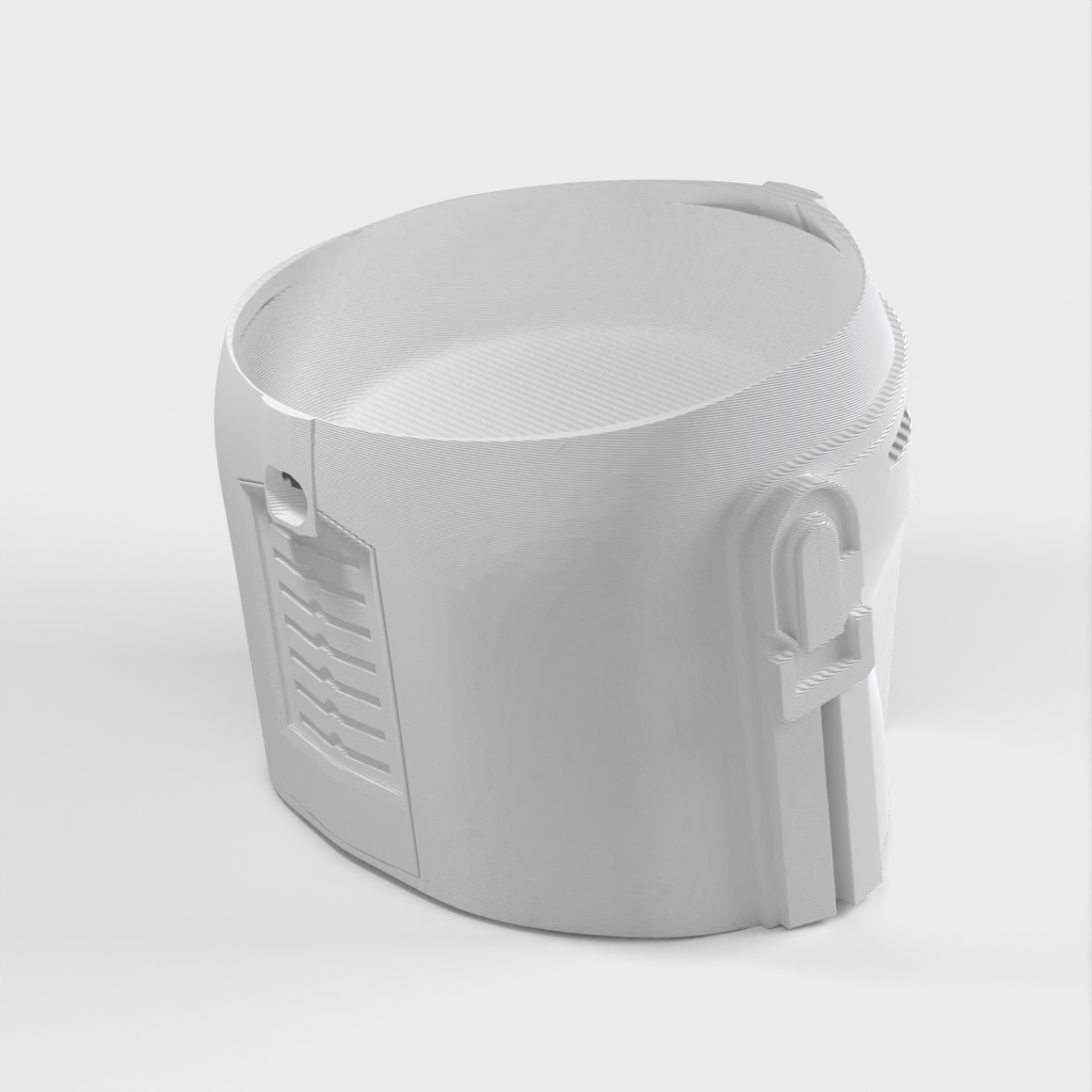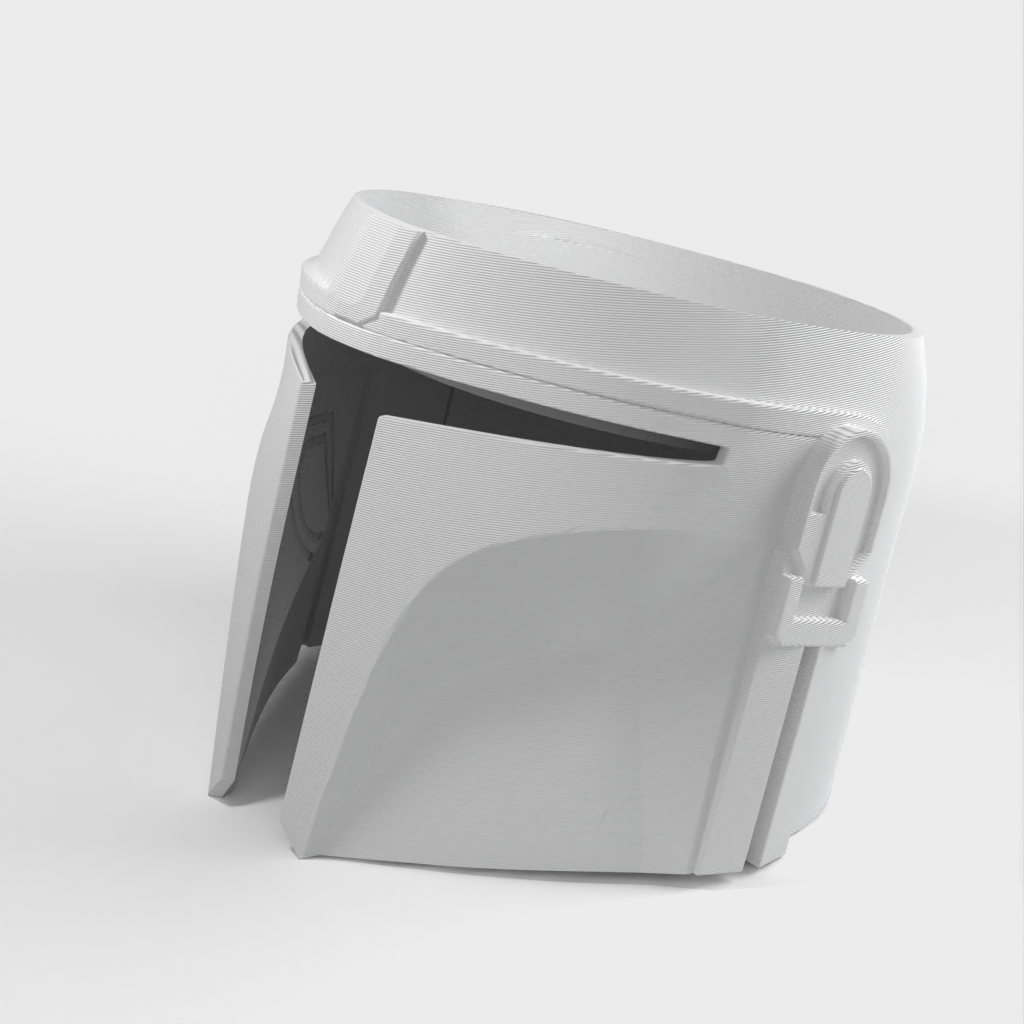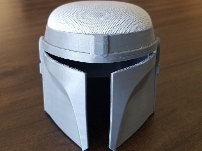 Divertido soporte para un Google Home Nest de segunda generación, diseñado como un casco mandaloriano de Star Wars.