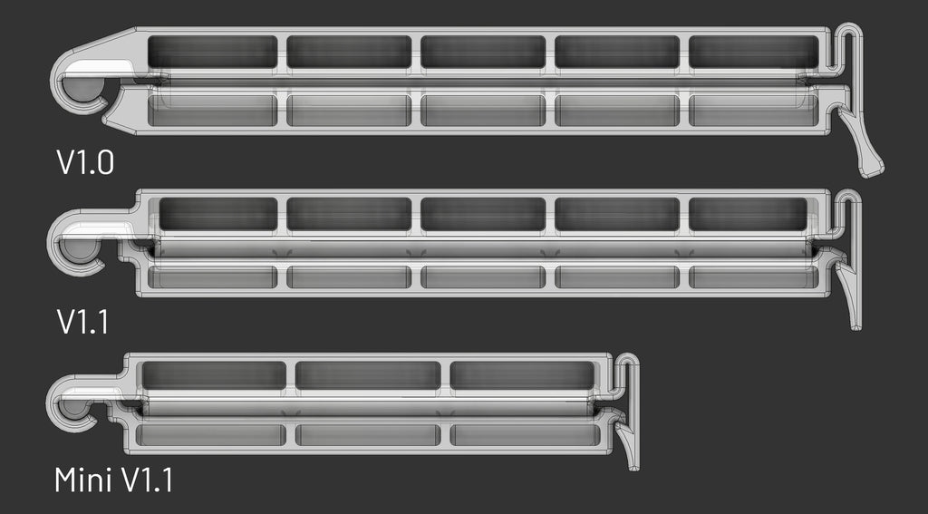 En 2021, se añadió una versión mini, que tiene un área de clip de 68 mm de ancho, utiliza aproximadamente un 50% menos de material que la V1.1, y clips más apretados (cavidad de 0,25 mm frente a 0,5 mm) para sellar bolsas pequeñas y delgadas con mayor eficacia.