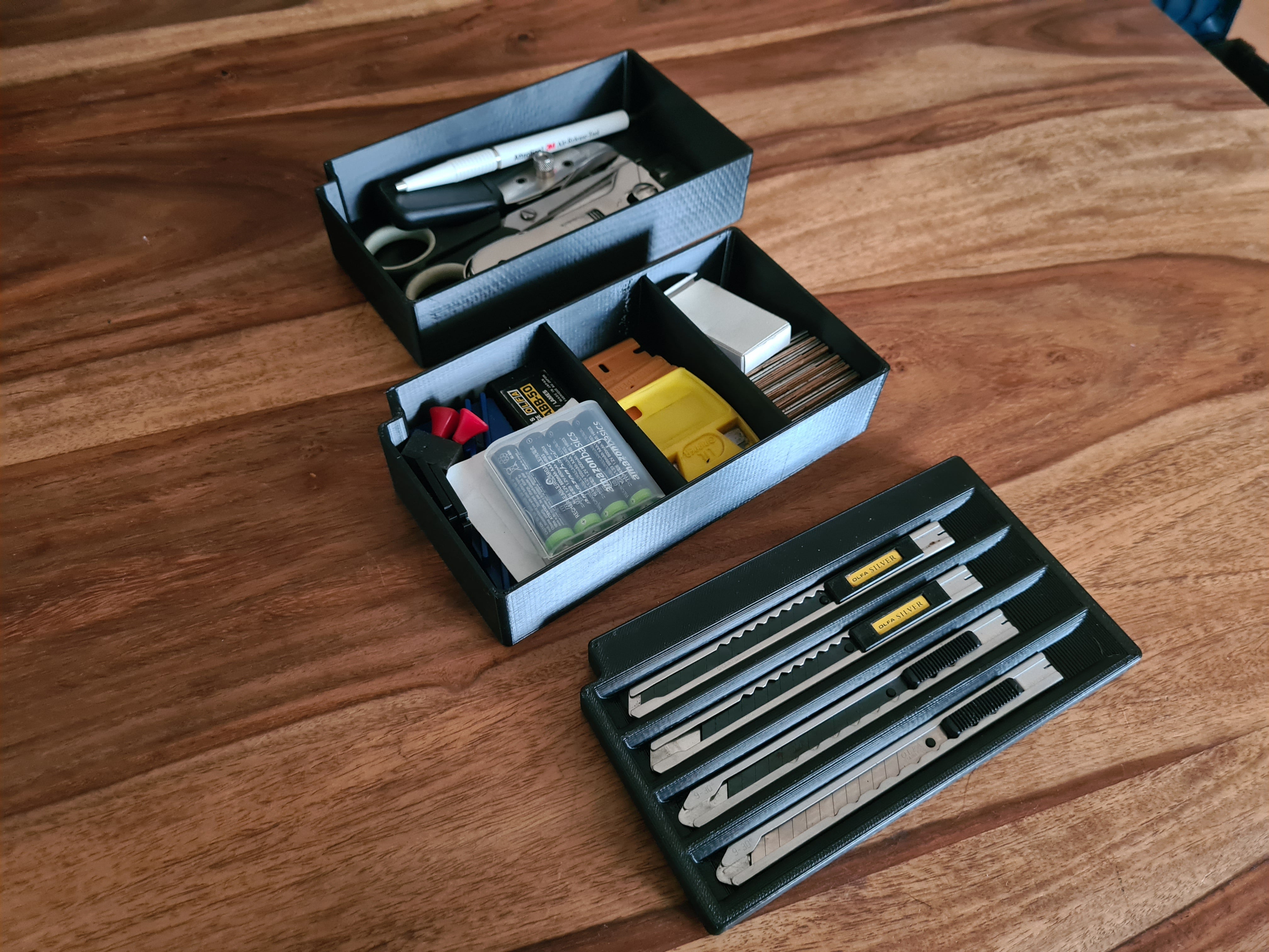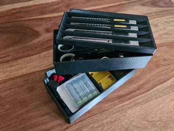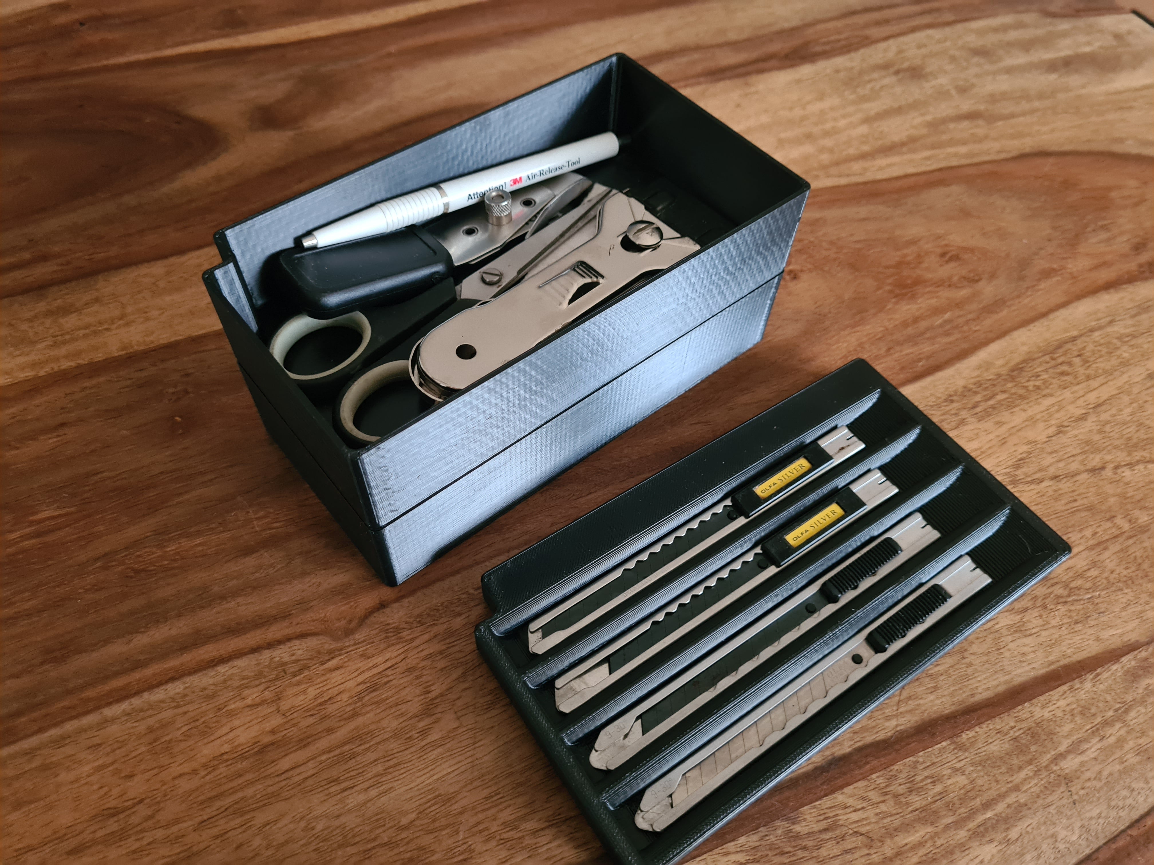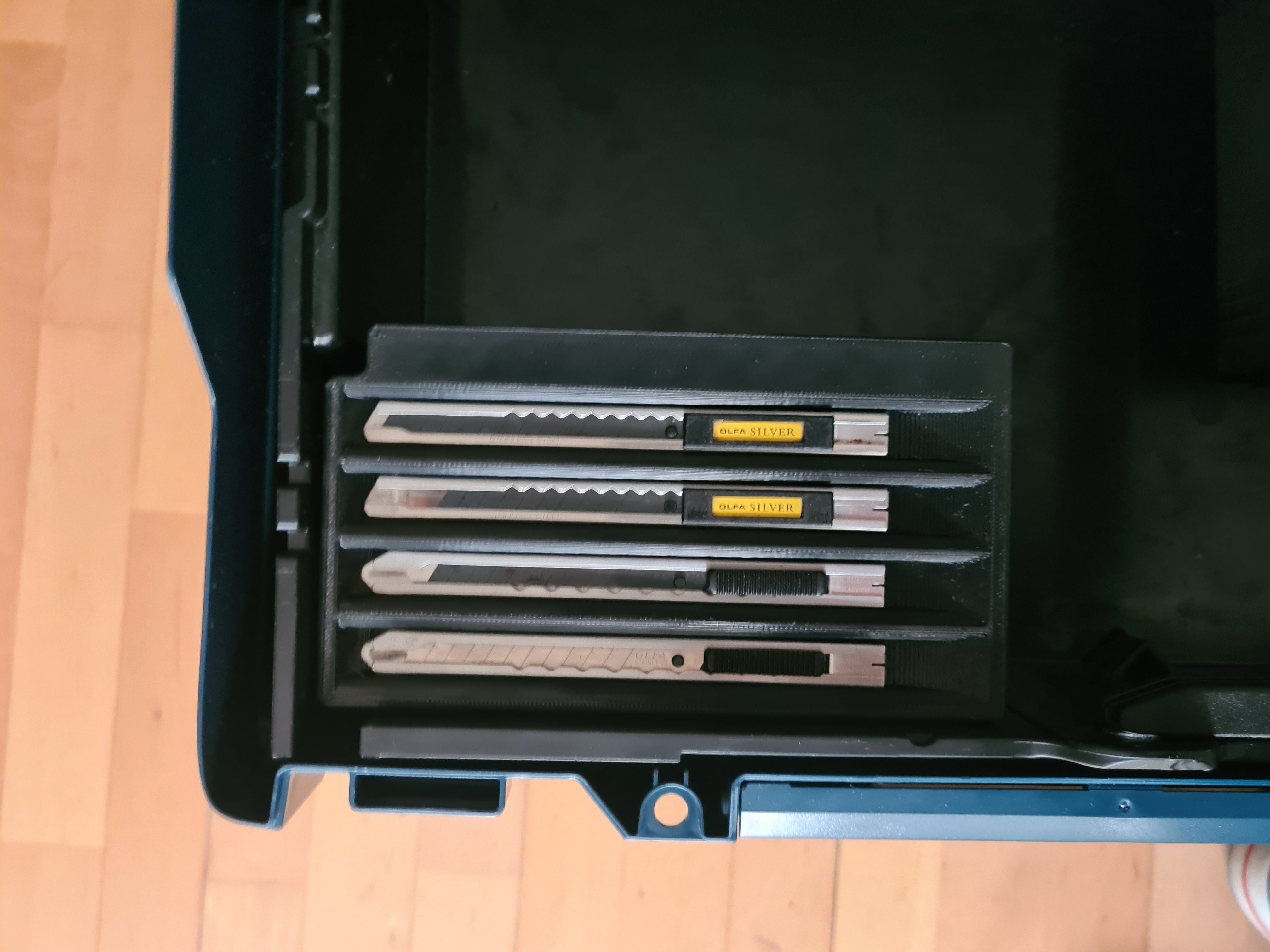 La caja está dividida en prácticos compartimentos, uno de los cuales está dedicado a su cúter para un acceso rápido y seguro. Además, contiene dos compartimentos de almacenamiento adicionales que son ideales para organizar recambios, cuchillas de afeitar, baterías pequeñas u otros consumibles similares. Las cajas modulares inferiores pueden albergar herramientas especiales adicionales, lo que contribuye a un espacio de trabajo ordenado y eficiente.