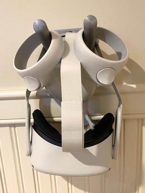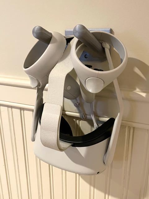 ¡También funciona perfectamente como colgador Ocuclus Quest-2! Acóplalo lo suficientemente cerca de un enchufe para permitir la recarga.