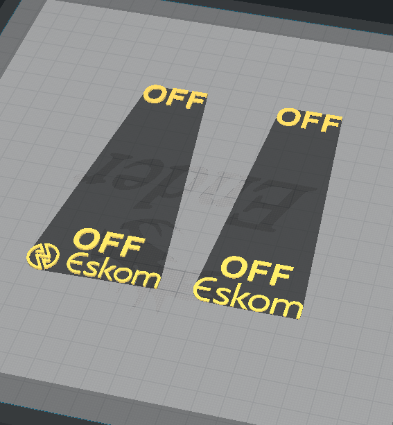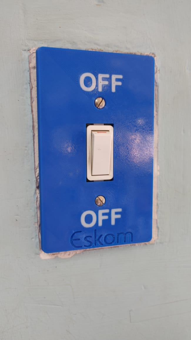 Esta es una cubierta de interruptor de luz con una representación humorística de la situación de 'corte de carga' que todos los sudafricanos conocen y temen. Hay cuatro archivos separados con el texto separado de la placa, para que pueda montar los modelos en su cortadora y hacer una impresión en dos colores.