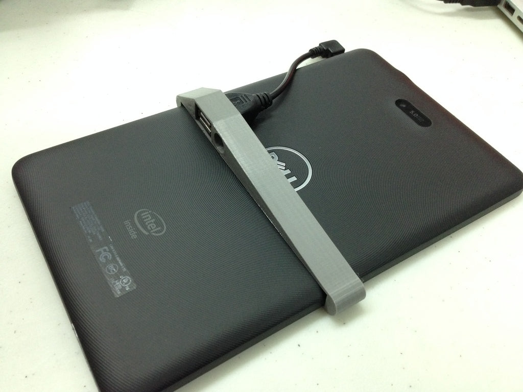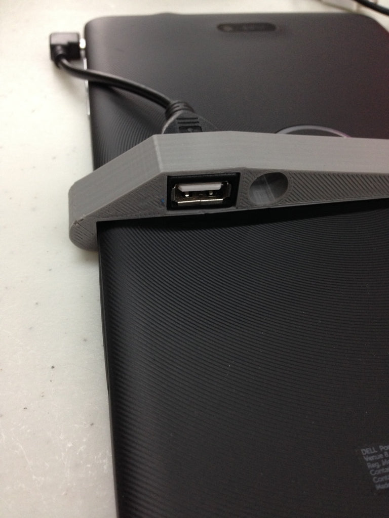 Este soporte especialmente diseñado se adapta a una tableta 'Dell Venue 8 Pro'. Permite montar de forma segura un cable USB OTG en el cuerpo del dispositivo para evitar tensiones en el pequeño puerto mini USB. Al evitar daños en el puerto, que también se utiliza para cargar, prolonga la vida útil del soporte.
