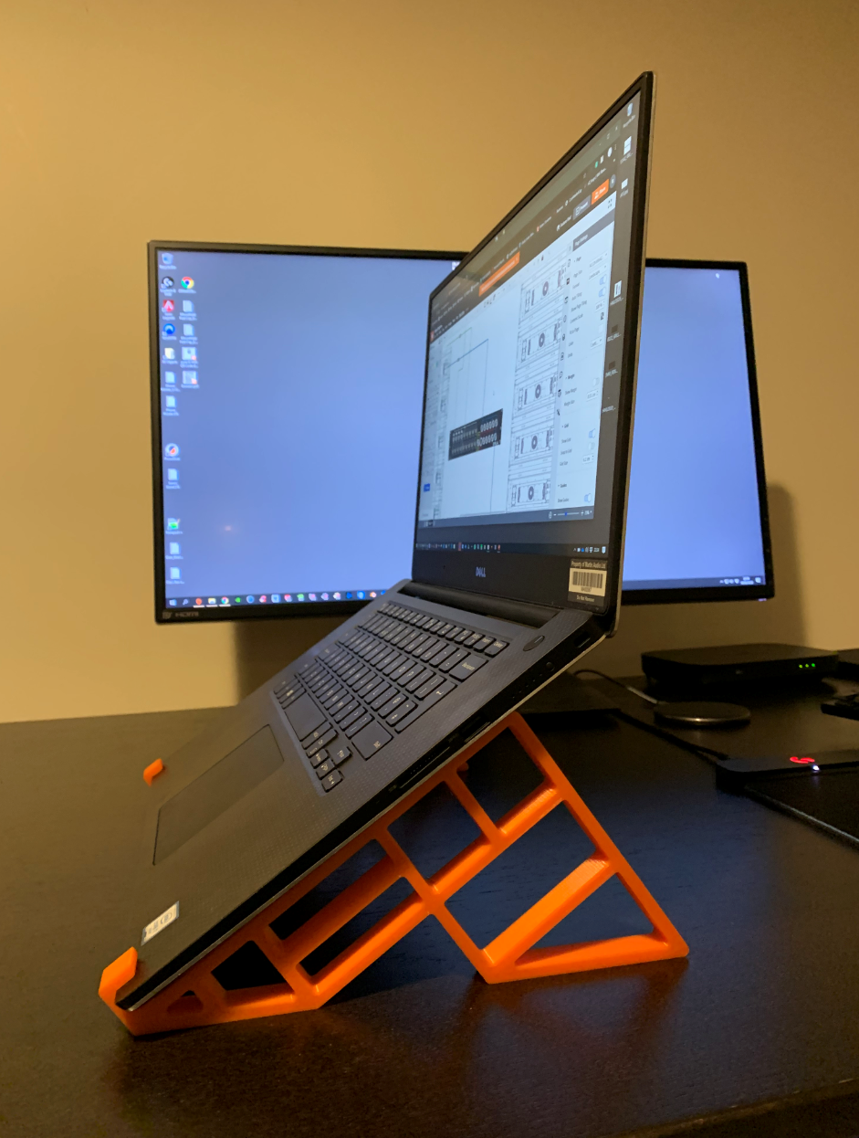 Soporte de portátil para Dell XPS 15. El soporte eleva la pantalla a unos 170 mm y la coloca en el ángulo perfecto para una posición de pantalla plana cuando está totalmente suspendida. El soporte encaja perfectamente en la cama MK3 y se imprime con SUNLU PETG. Tarda unas 9 horas en imprimirse y utiliza 3 circunferencias con un ángulo de relleno de 55 grados y un Gyroid Infill del 15%.
