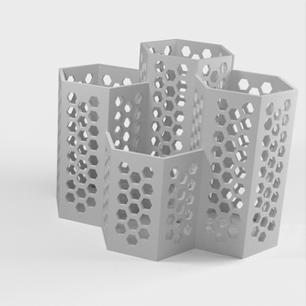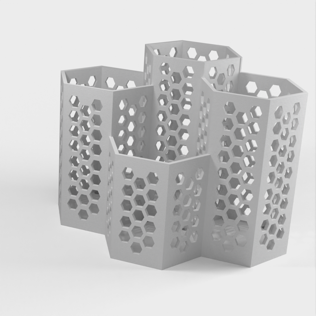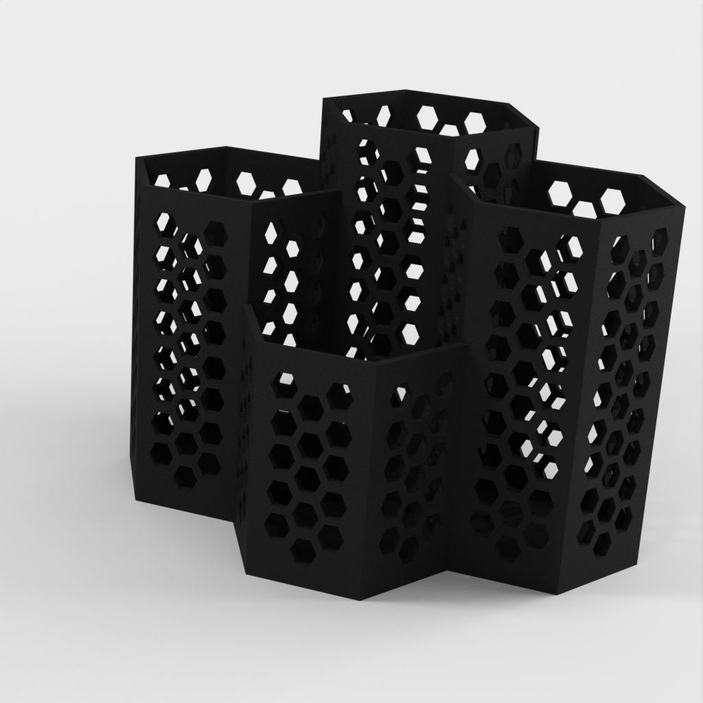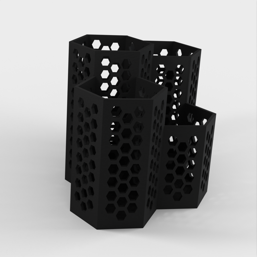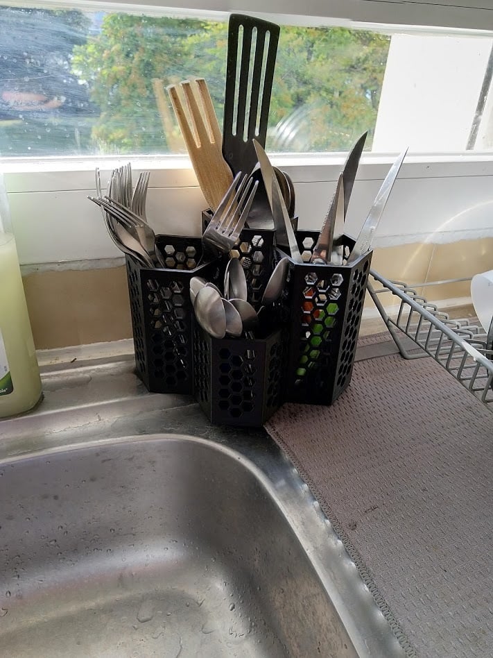 Un práctico escurridor de cubiertos dividido en cuatro cajas: una para cucharas pequeñas, otra para tenedores, otra para cuchillos y una caja más grande para cucharas más grandes y otros utensilios de cocina. Pequeños agujeros en el fondo ayudan a que el agua se escurra.