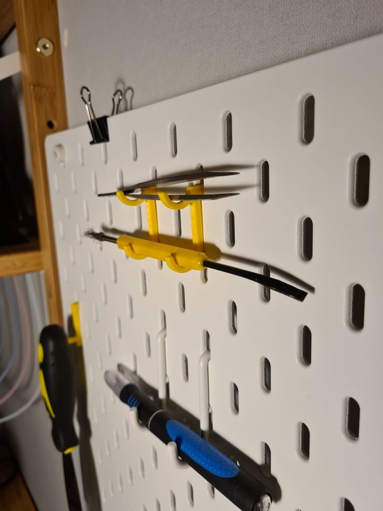 Sencillo gancho y doble portabolígrafos diseñado para el tablero de clavijas Skådis de IKEA. El producto es muy resistente y se puede montar fácilmente directamente en la placa, por lo que es fácil de mantener un registro de sus bolígrafos y otros objetos pequeños directamente en su lugar de trabajo.