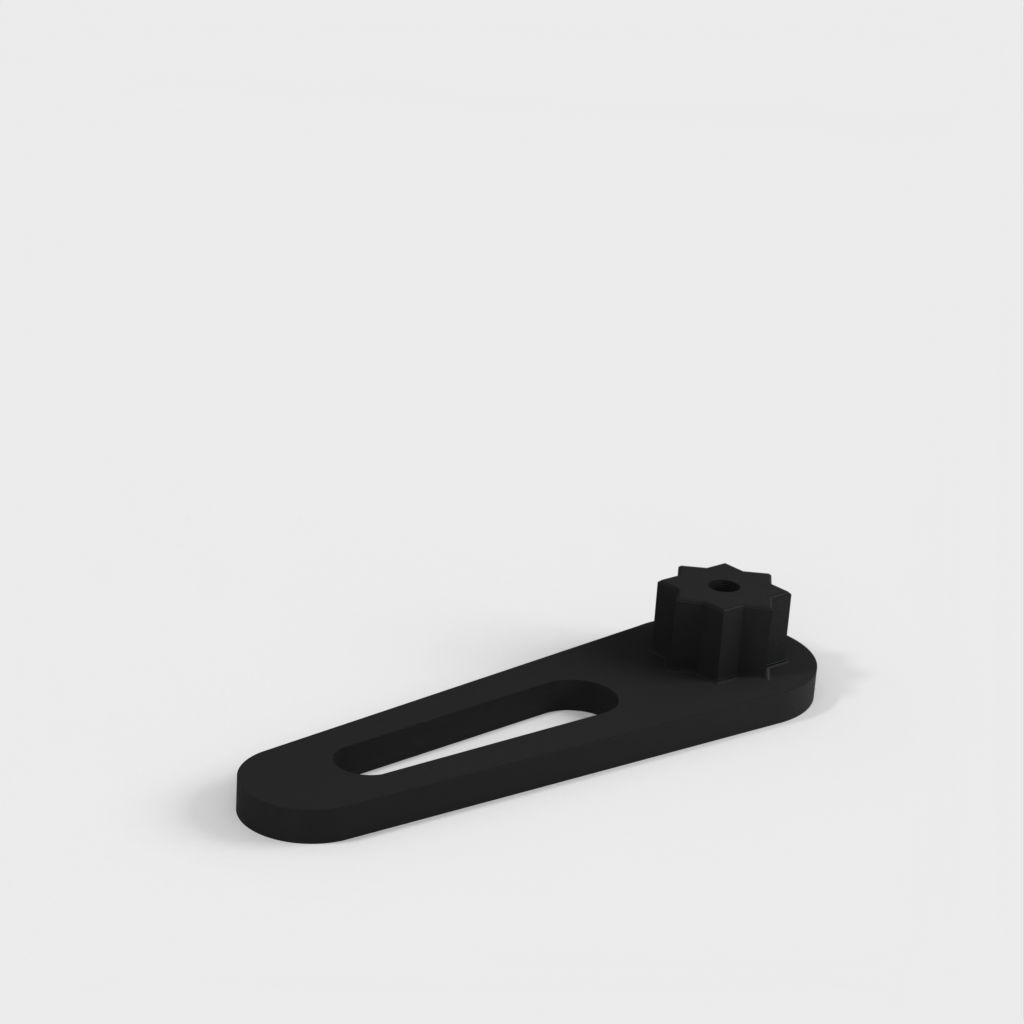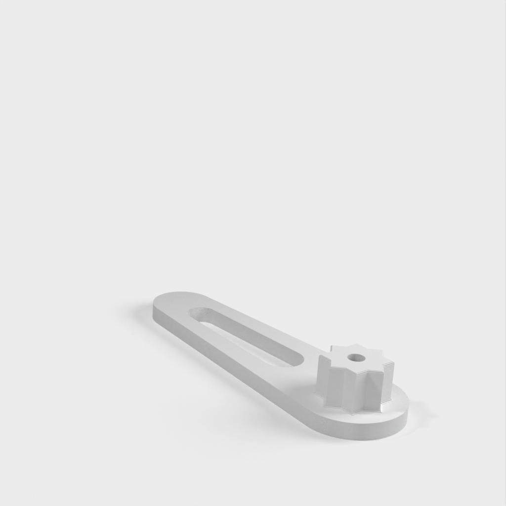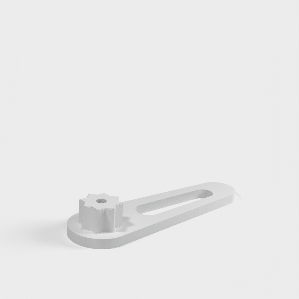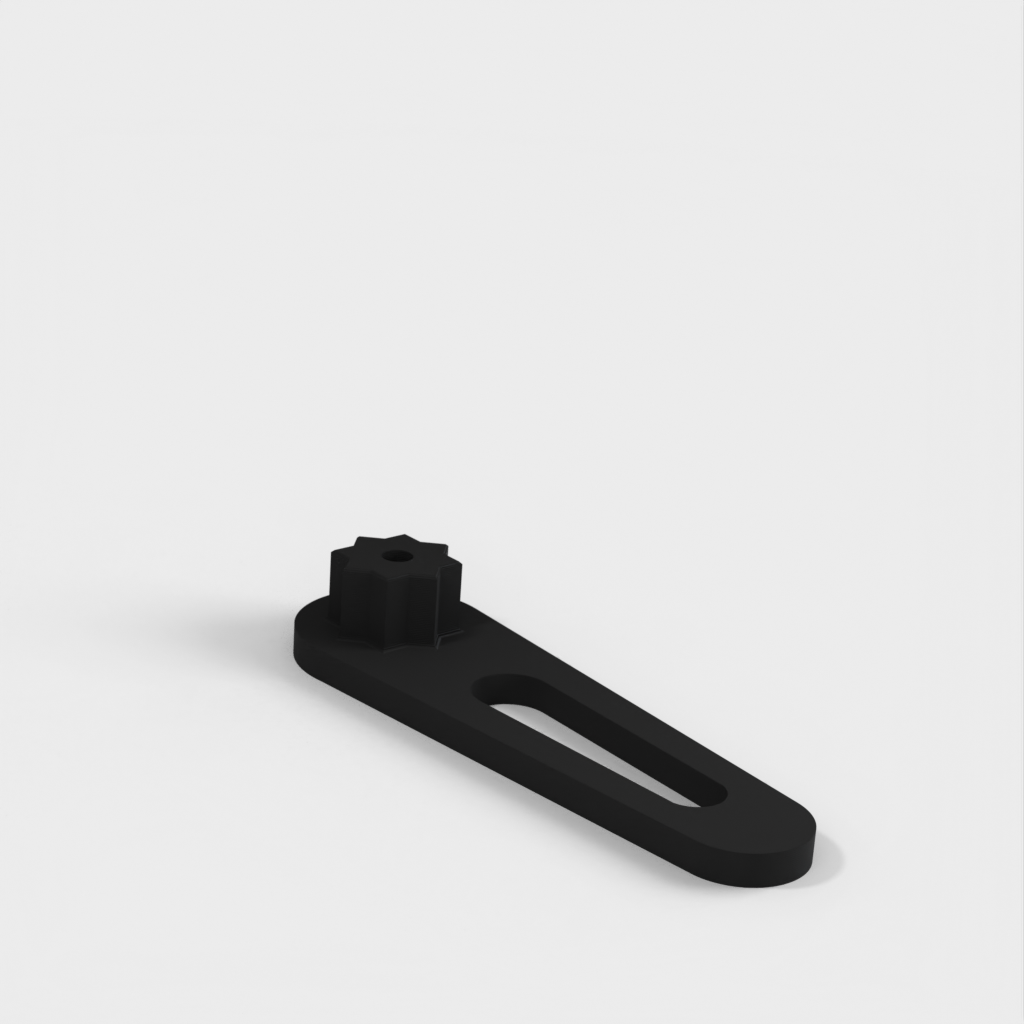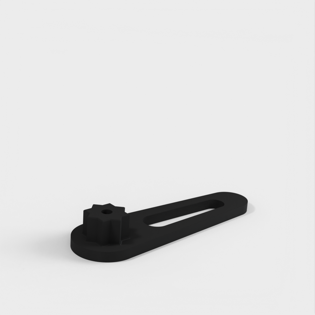 Una llave de plástico para usar en un barco con tapas tipo manija de cabrestante. Las manijas del cabrestante dañan el aluminio blando y brindan demasiada palanca, lo que provoca un apriete excesivo y bloqueo. Esta llave es corta porque las tapas a menudo se colocan en lugares incómodos y para evitar un apriete excesivo. Además, es mucho más barato que las manijas de los cabrestantes y las llaves de acero inoxidable cuando se caen por la borda.
