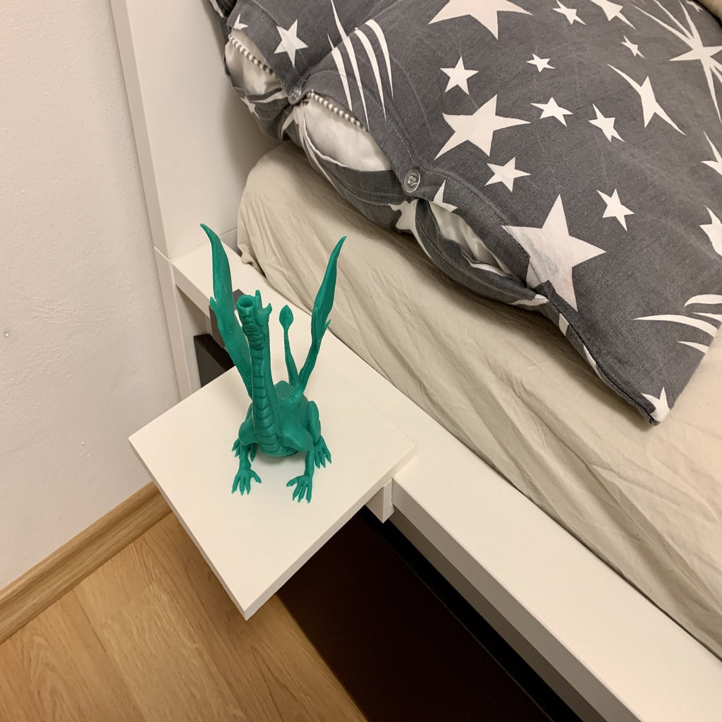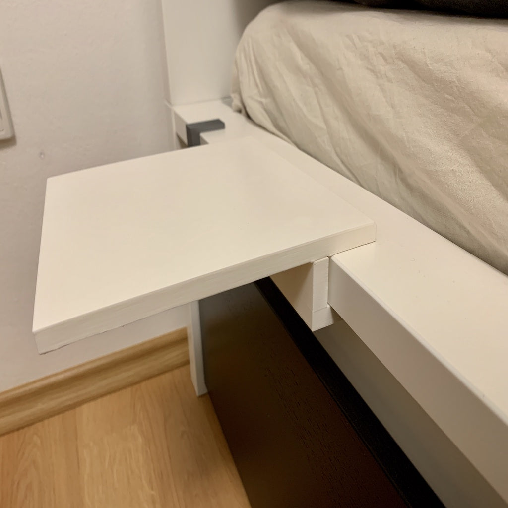 Esta es una pequeña mesa para tu teléfono o lo que quieras alcanzar desde la cama. Se adapta a la cama IKEA MALM y no se necesitan tornillos ni pegamento para los muebles, debe encajar perfectamente (pero hay algunos agujeros preparados para tornillos si lo desea).