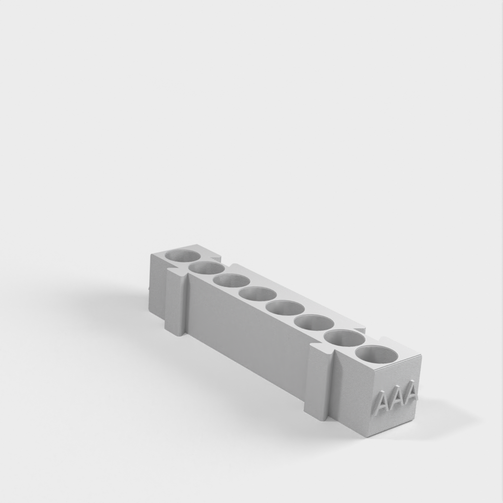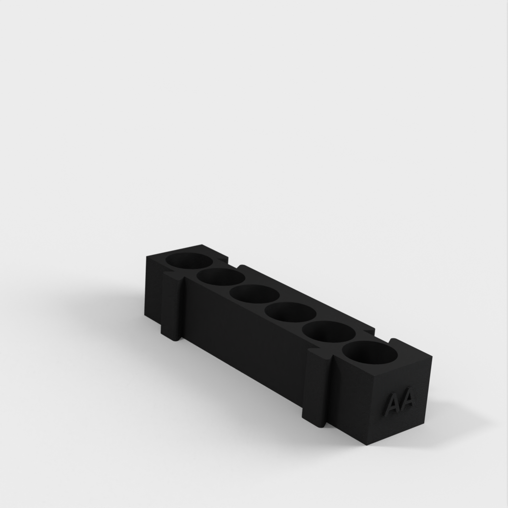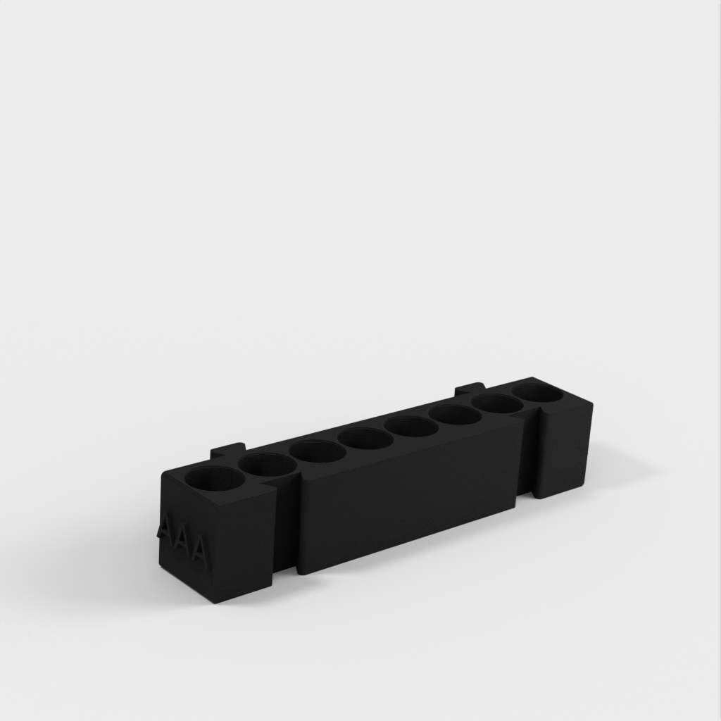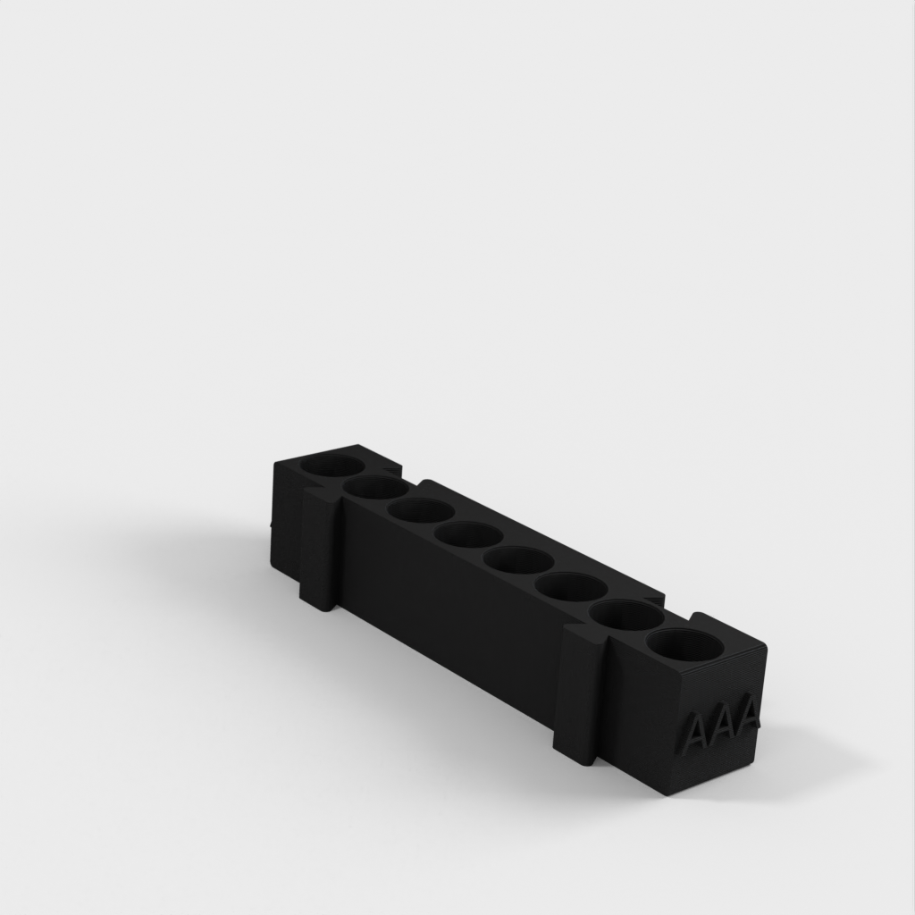 Este es un portapilas modular que ofrece diferentes soportes para cada tipo de pila. Todos los soportes tienen la misma longitud y pueden engancharse entre sí en cualquier combinación que desee. Es una solución ideal para organizar su escritorio y tener las pilas siempre a mano. Si añade a la colección un portapilas AA y un monedero, aumentará aún más su funcionalidad.