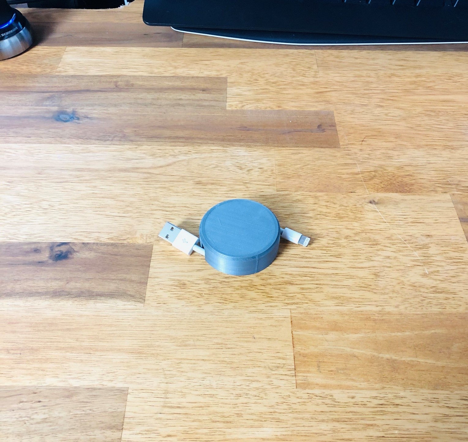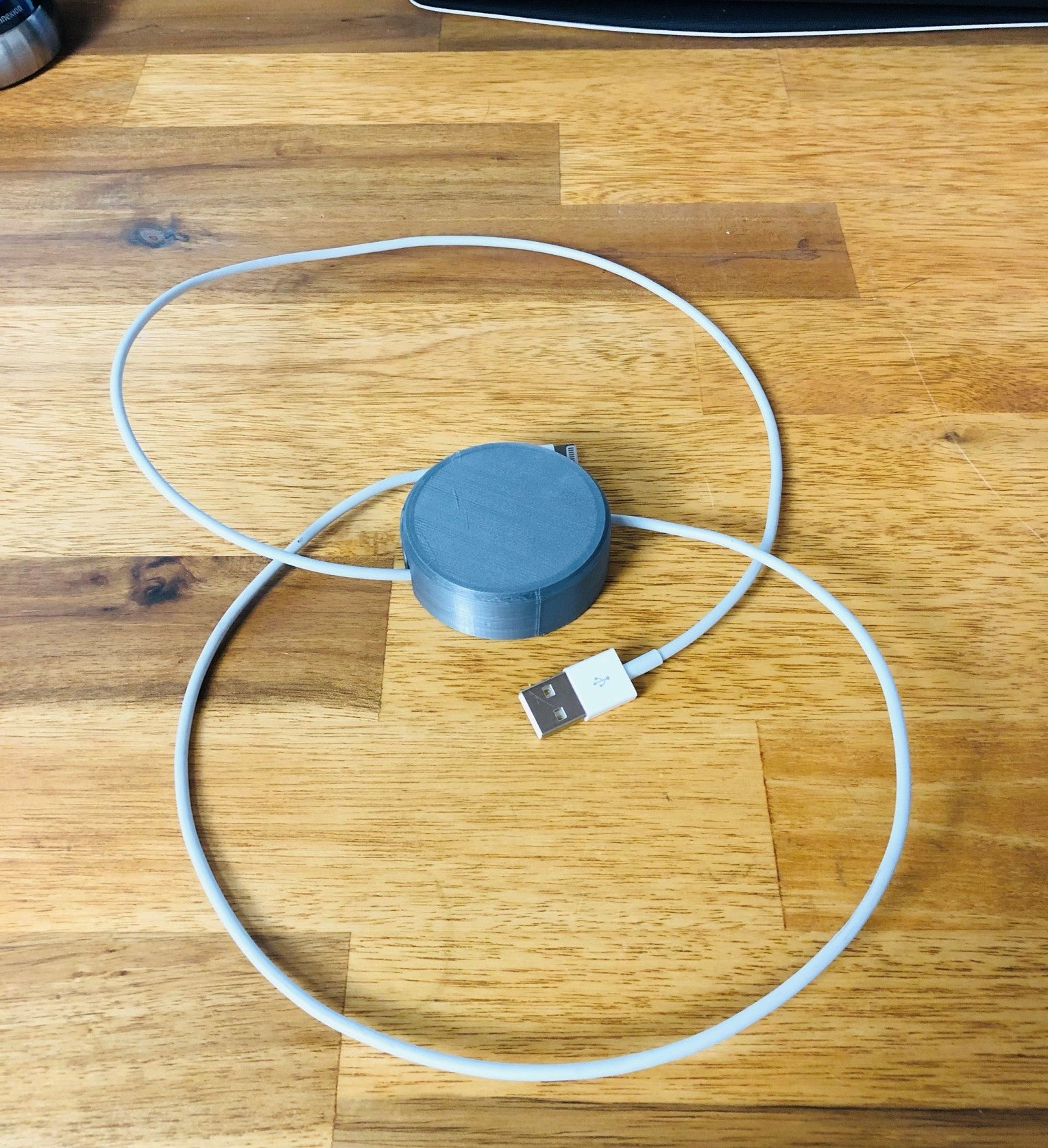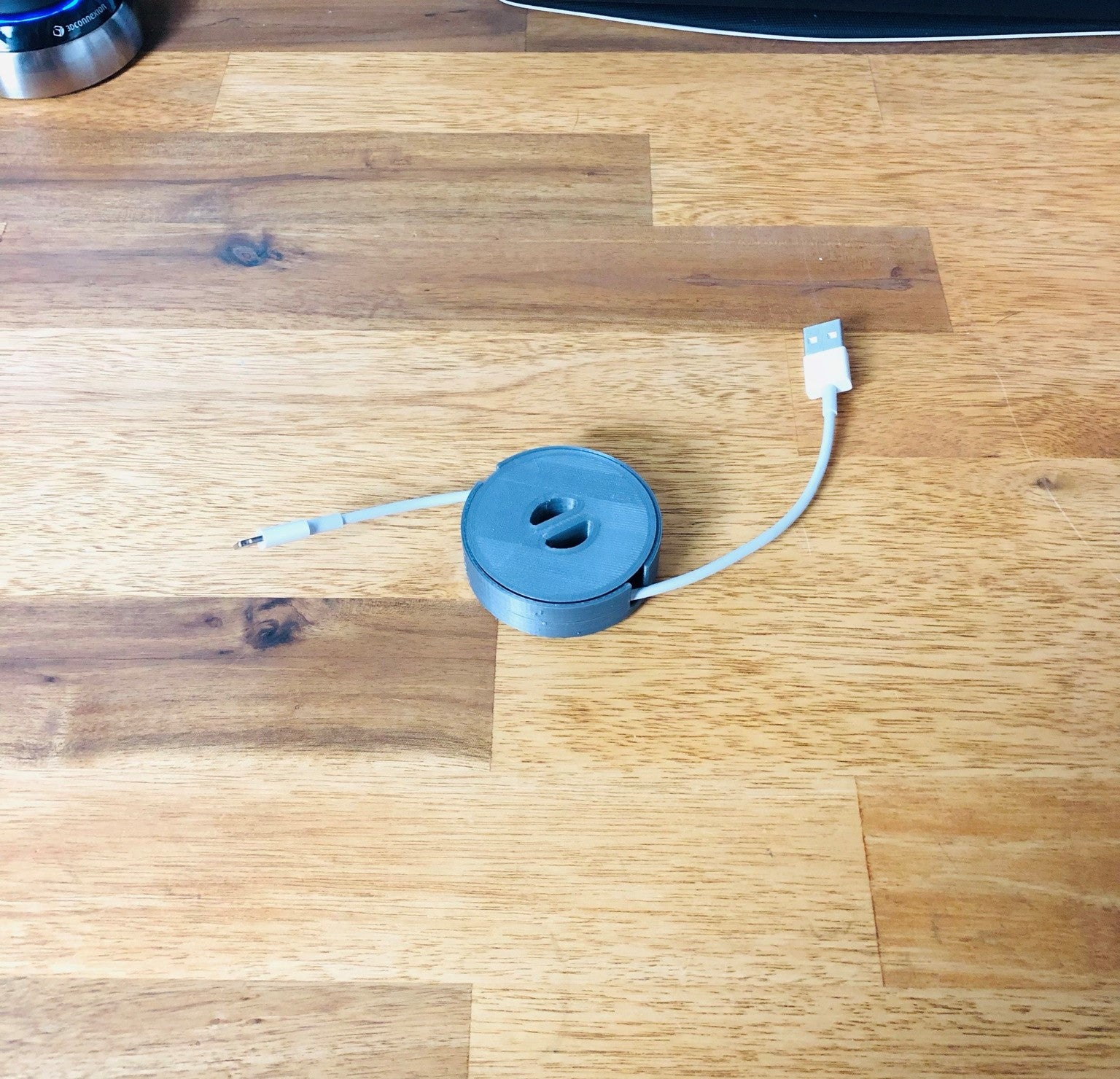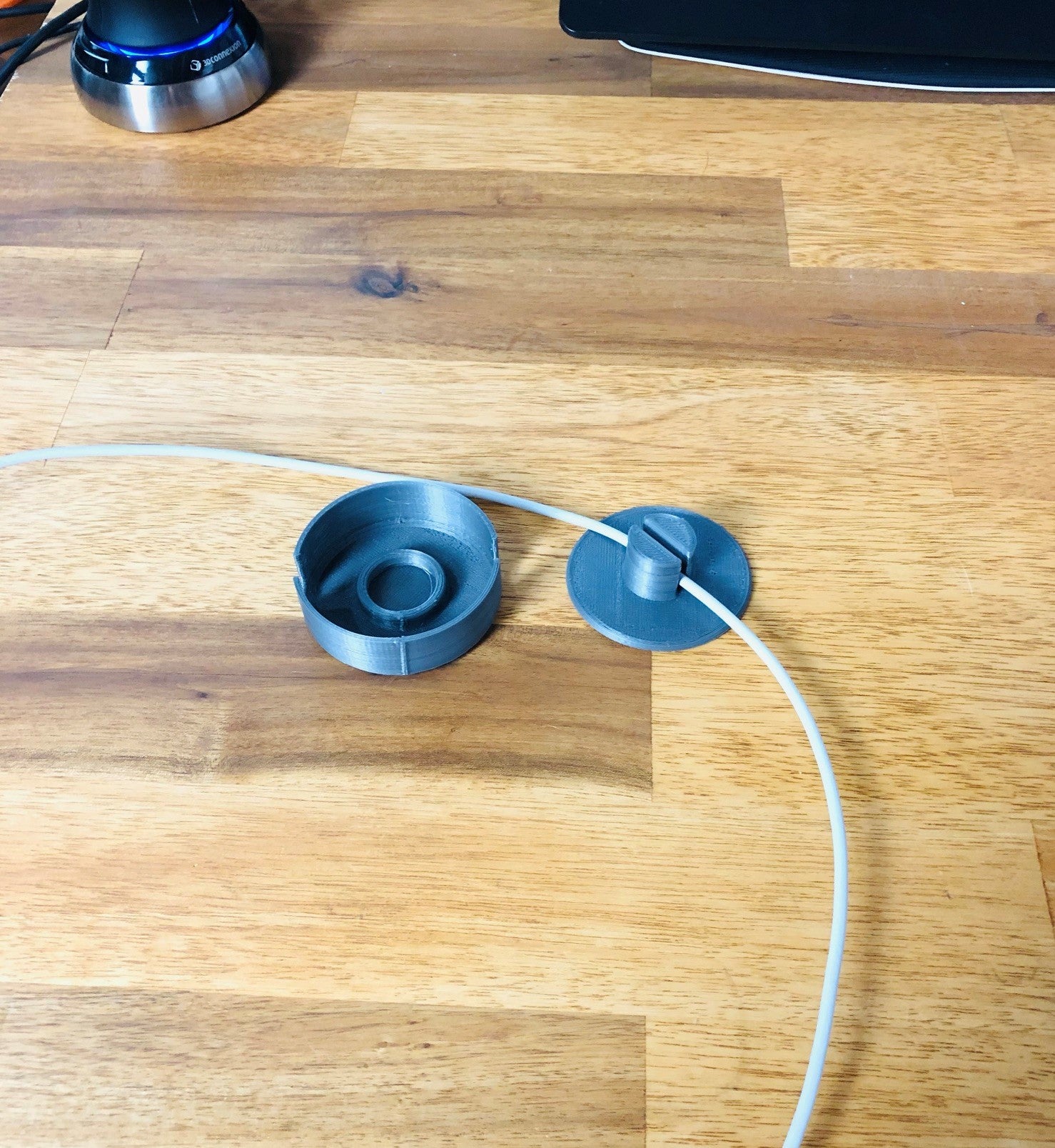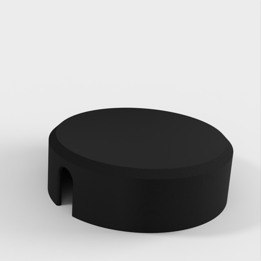 Este es un estuche para guardar el exceso de cables alrededor de su estación de trabajo, o puede utilizarlo para guardar sus auriculares sobre la marcha. Tiene una construcción simple que encaja a presión. Hay una ranura en la pieza superior en la que encajará la pieza inferior. Inserta el cable en la ranura de la pieza inferior, alinea la pieza superior con la inferior y presiónalas hasta que encajen. Gira la pieza inferior utilizando las lengüetas de la parte posterior para enrollar el cable. Tire de los extremos del cable para extenderlo.