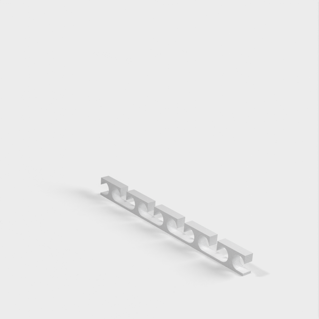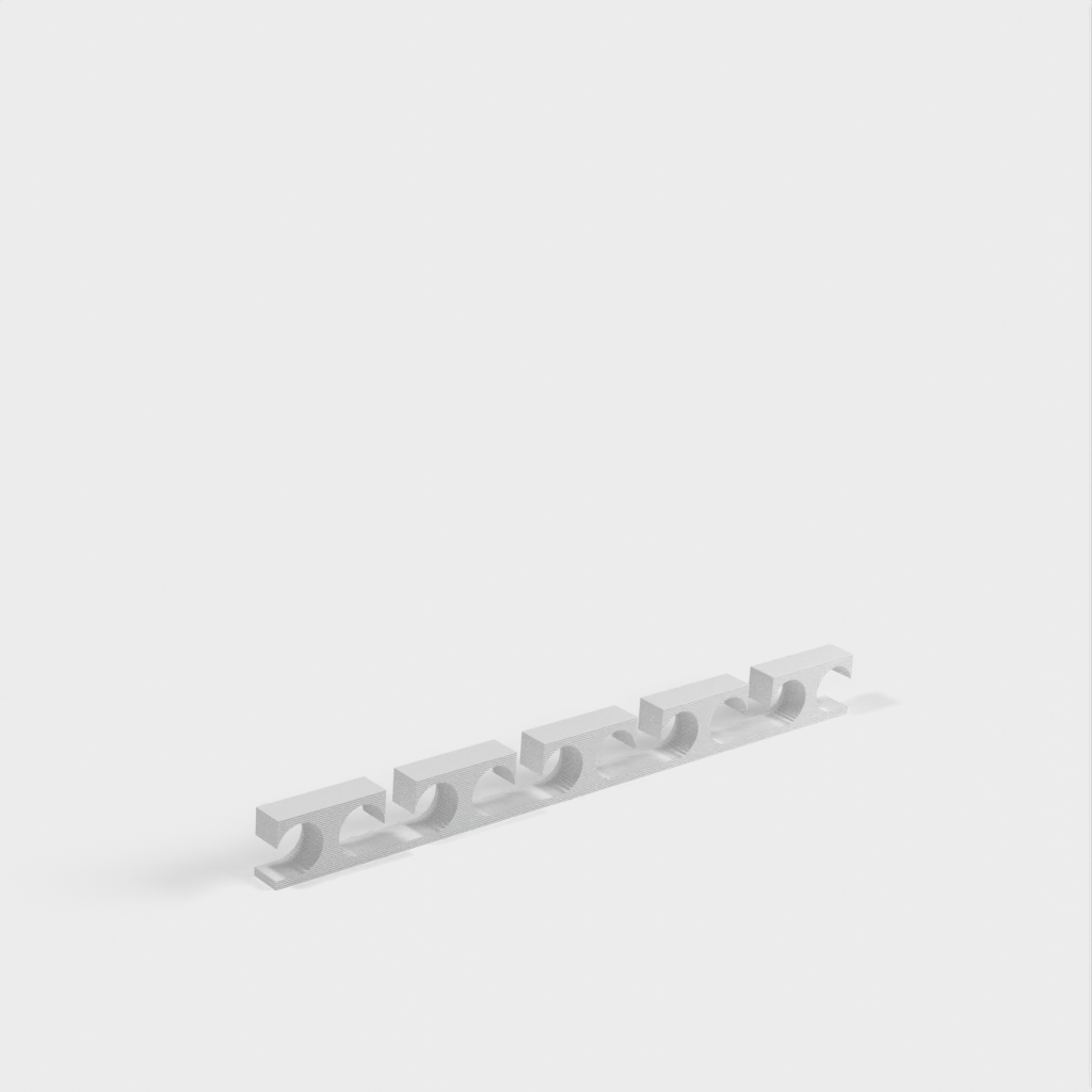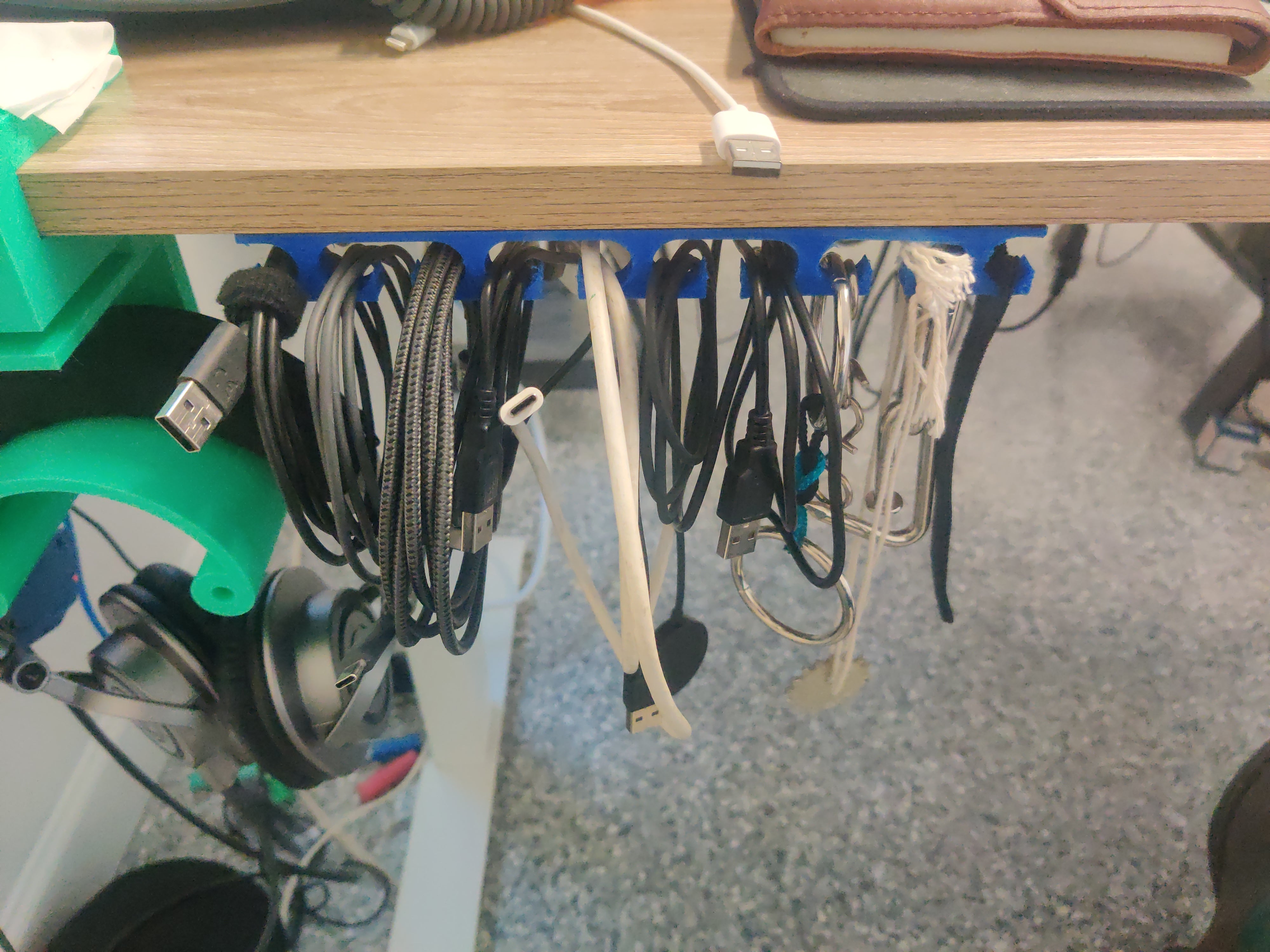 Este es un pequeño organizador de cables que hice para mantener los cables USB ordenados en mi escritorio. Lo fijé debajo de mi escritorio con cinta adhesiva de doble cara. Personalmente utilicé cinta Tesa de 10 mm, pero también se puede utilizar cinta 3M. Este producto ayuda a mantener tu área ordenada organizando tus cables USB de forma fácil y eficiente.