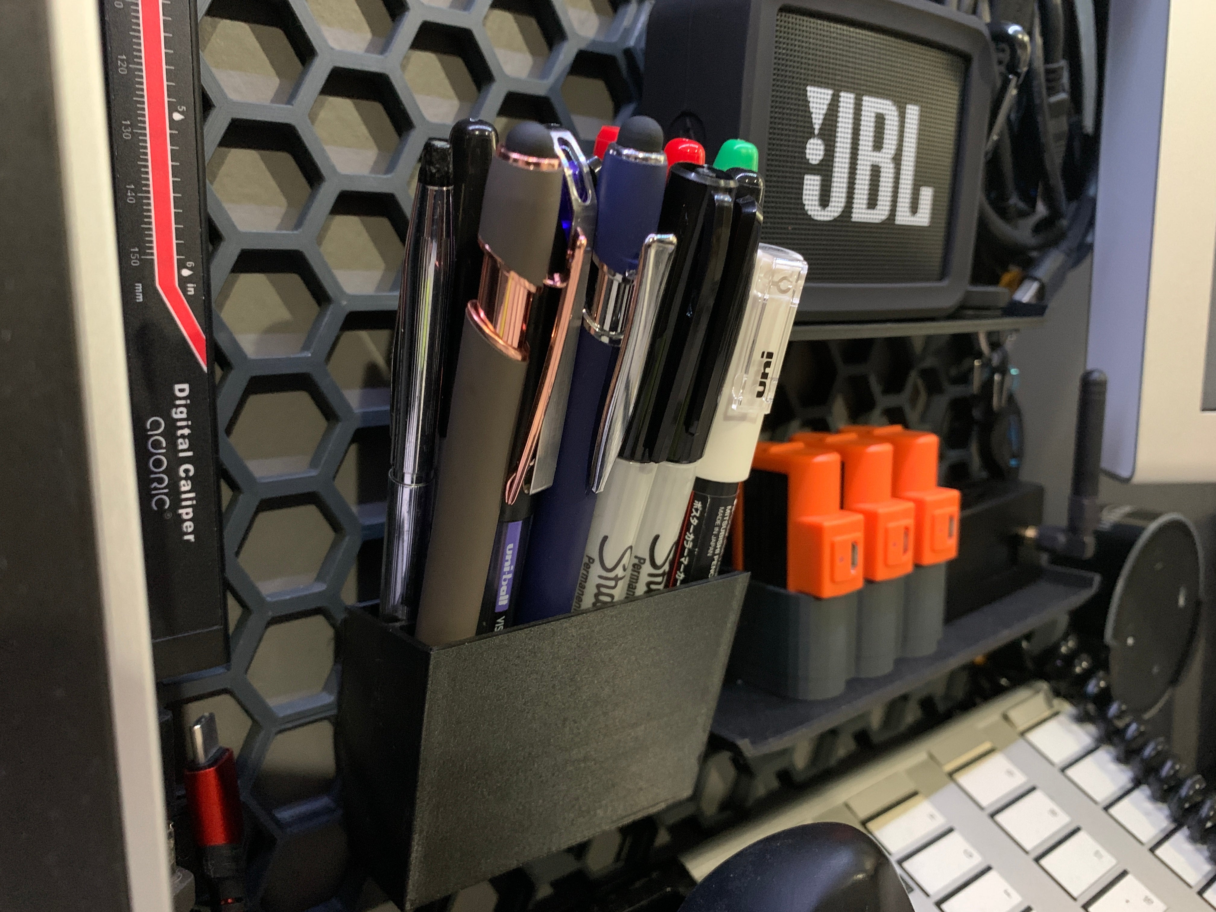 - Almacenamiento eficiente de bolígrafos, lápices, marcadores y mandos a distancia.