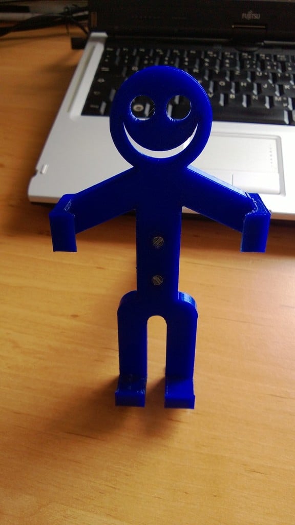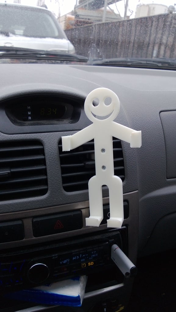 Soporte personalizado para smartphone con forma de hombre que puede alojar diferentes dispositivos smartphone. El soporte puede ajustarse fácilmente para adaptarse a distintos tamaños de smartphone. Dispone de dos adaptadores diferentes: uno que permite colocar la figura sobre el escritorio y otro que se puede acoplar a la rejilla de ventilación del coche. También existe la opción de crear tus propios adaptadores, simplemente creando una placa que se puede atornillar a la parte posterior de la figura.