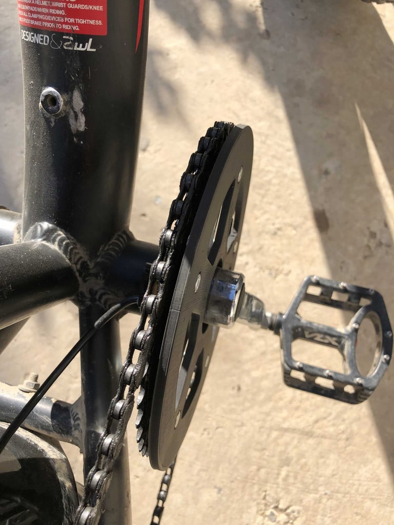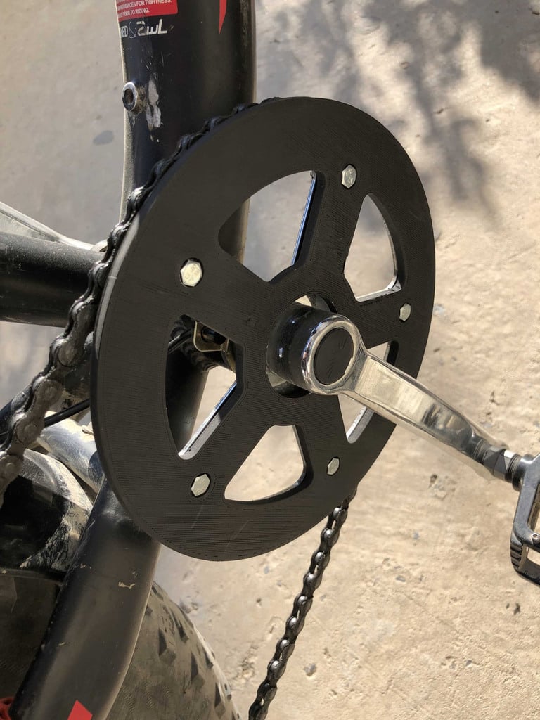 Cubrecadenas de diseño elegante y sencillo para una bicicleta, apto para bicicletas con un diámetro exterior de 190 mm, un diámetro interior de 45 mm y una distancia entre pernos desde el centro de 70 mm. Este cubrecadenas protege y cubre la cadena de tu bicicleta, lo que hace que tu bicicleta sea más elegante y mantiene tu viaje más limpio. Es fácil de instalar simplemente quitando el pedal y usando 5 pernos M5 y 5 tuercas M5, que están incluidos en el kit de montaje.