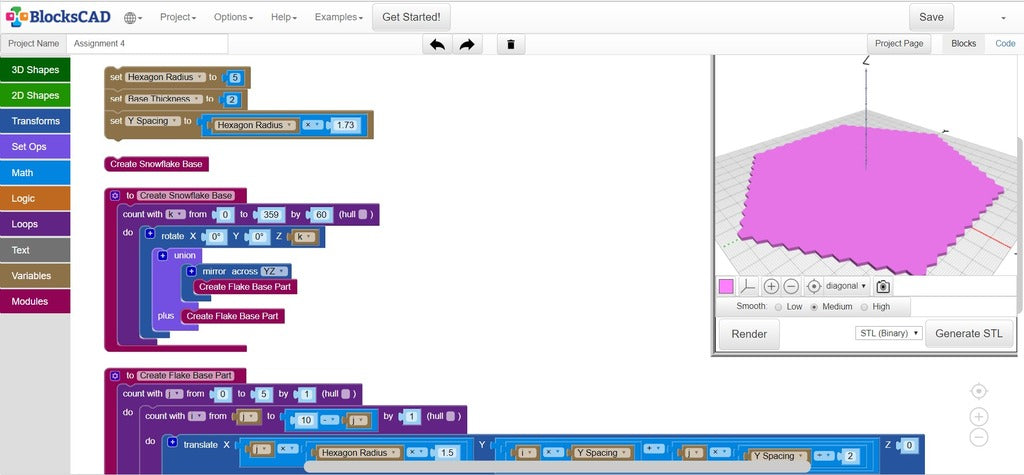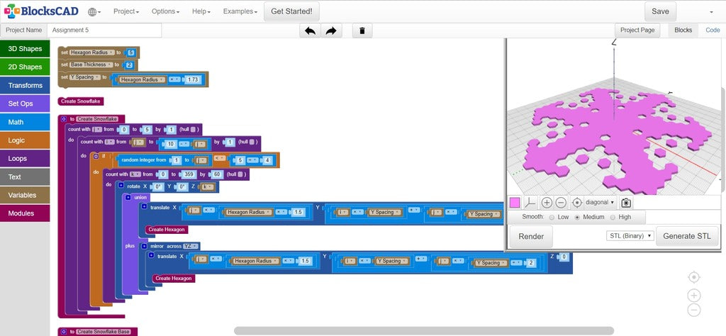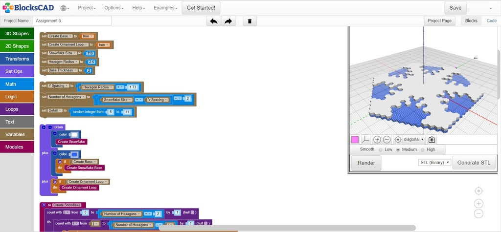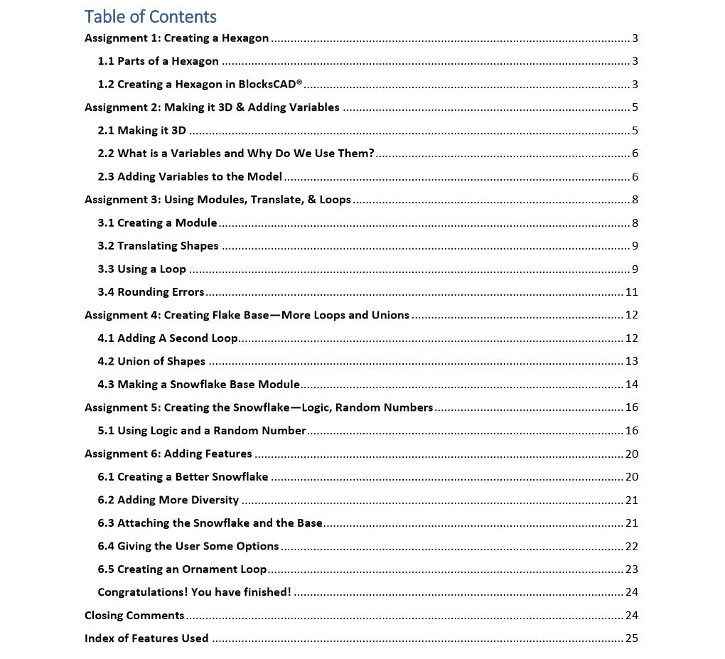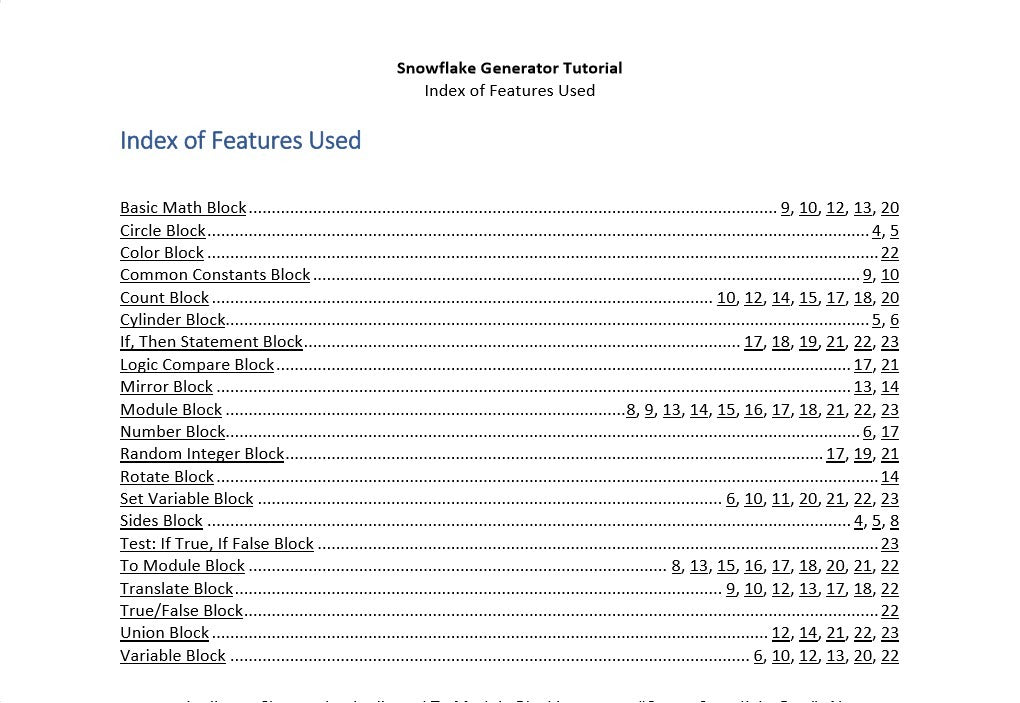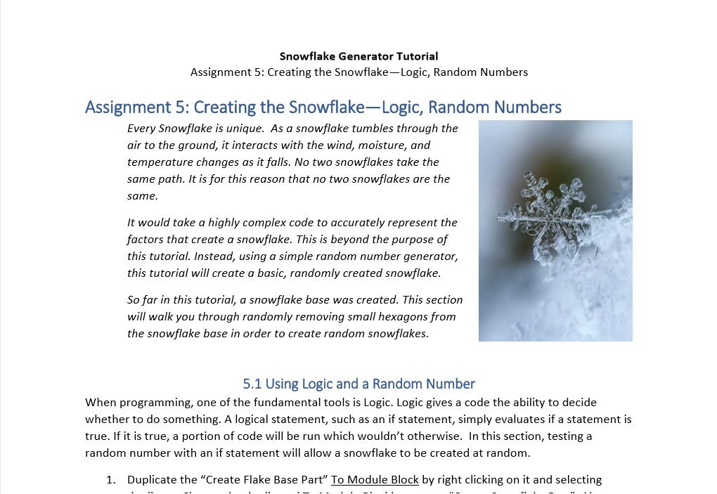Este Tutorial del Generador de Copos de Nieve ha sido creado como parte del Desafío de Copos de Nieve de BlocksCAD®. El tutorial está diseñado para aumentar el interés por los campos STEM (ciencia, tecnología, ingeniería y matemáticas) entre los estudiantes. Consiste en una guía paso a paso para crear un generador aleatorio de copos de nieve. Con siete archivos XLF, incluido el archivo completo 'Snowflake Generator.xlm', así como varias imágenes y cuatro archivos STL, los estudiantes pueden ver el aspecto que tendrá su trabajo en forma de copos de nieve impresos en 3D.