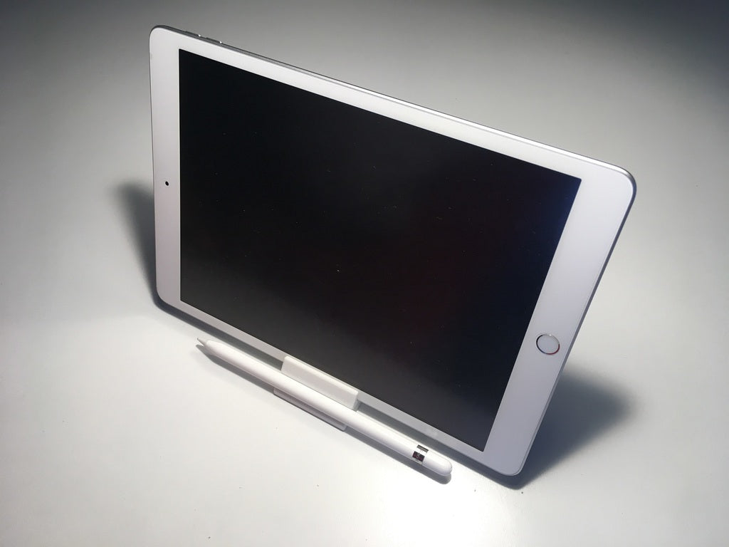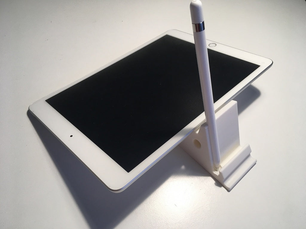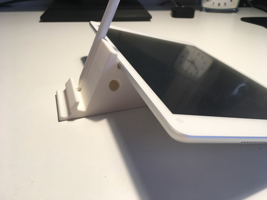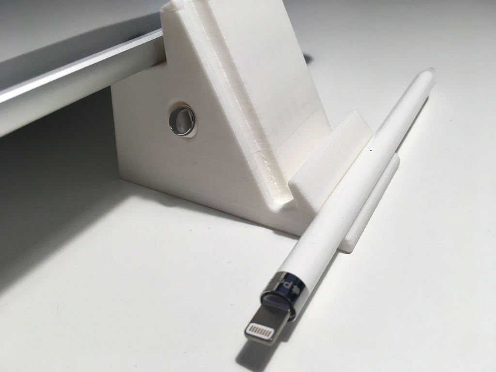 Soporte bidireccional para iPad con soporte para Apple Pencil y su capuchón. El soporte puede mantener el iPad en una posición cómoda para ver vídeos, mientras que el soporte para Apple Pencil mantiene el lápiz y el capuchón organizados y al alcance de la mano.
