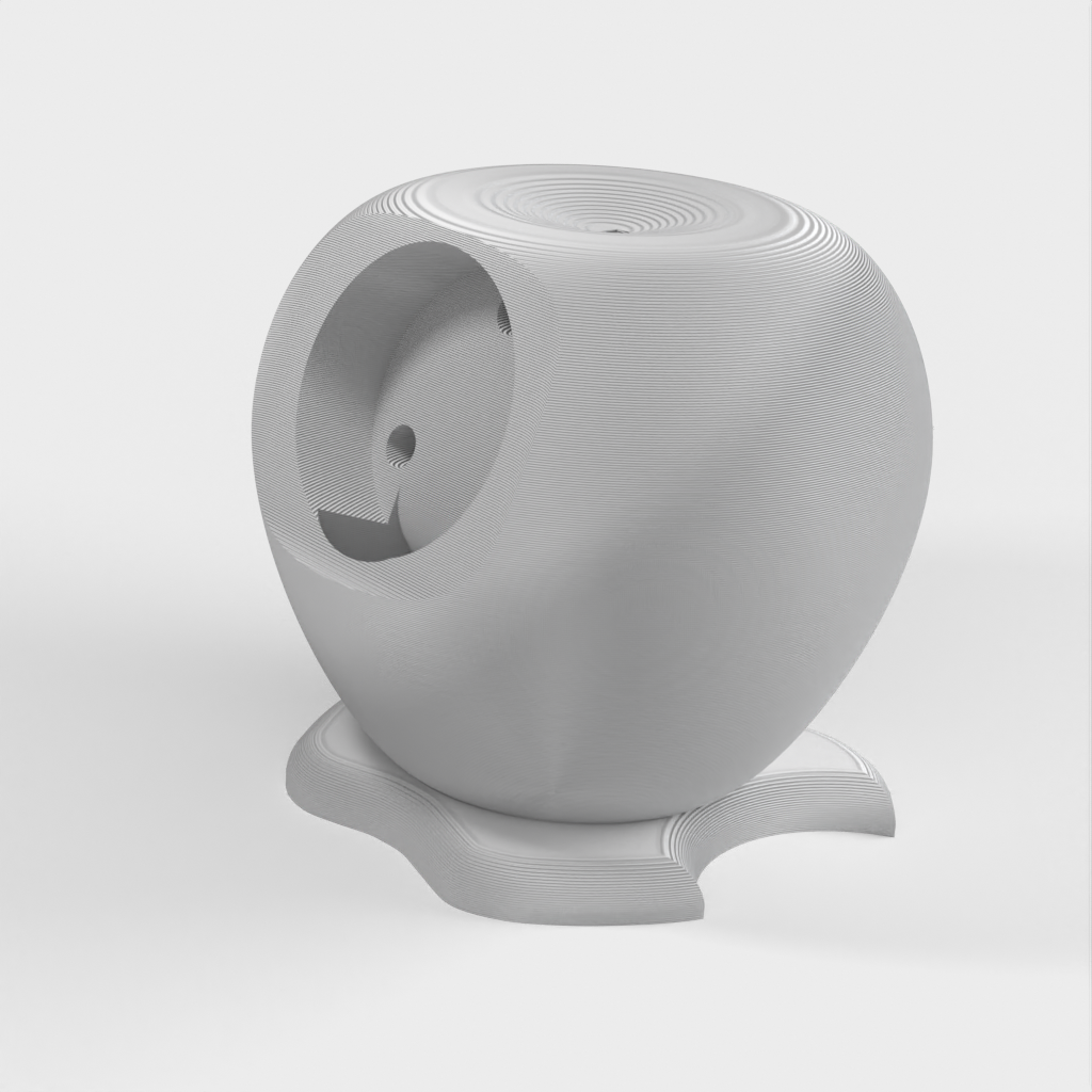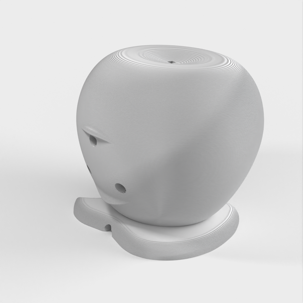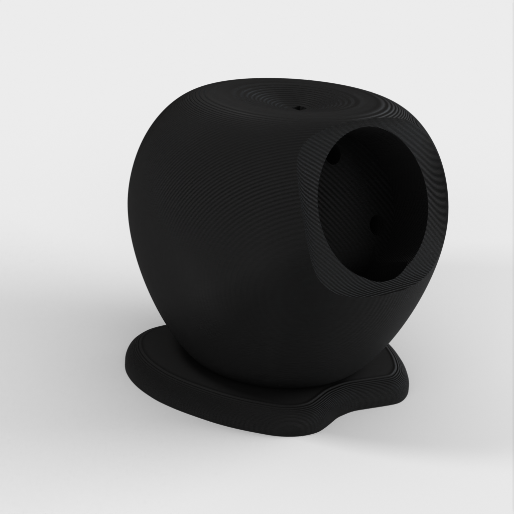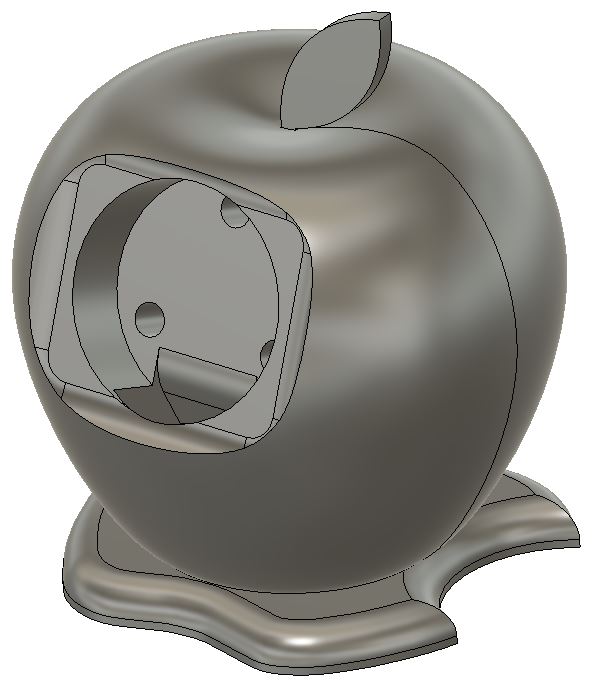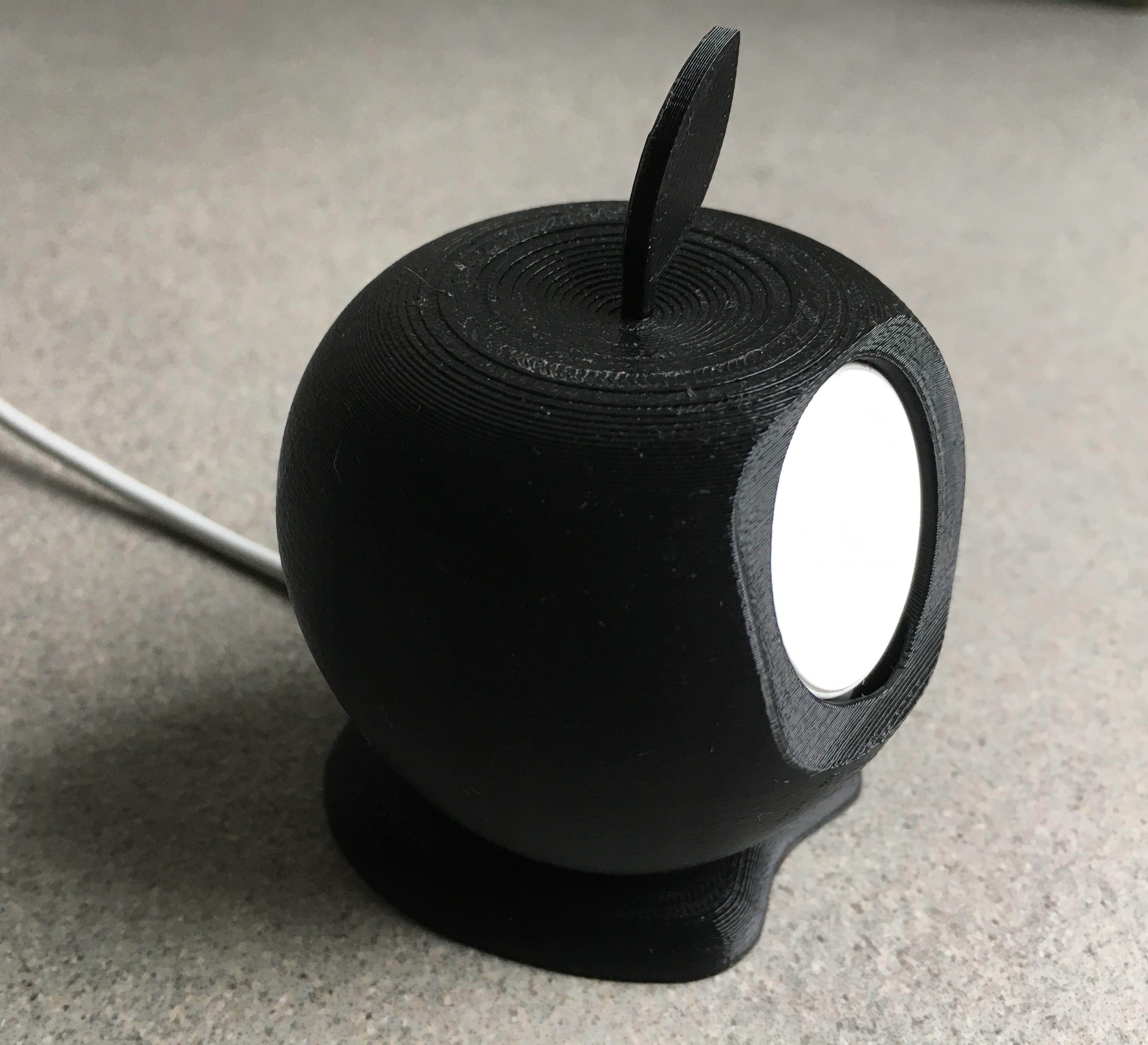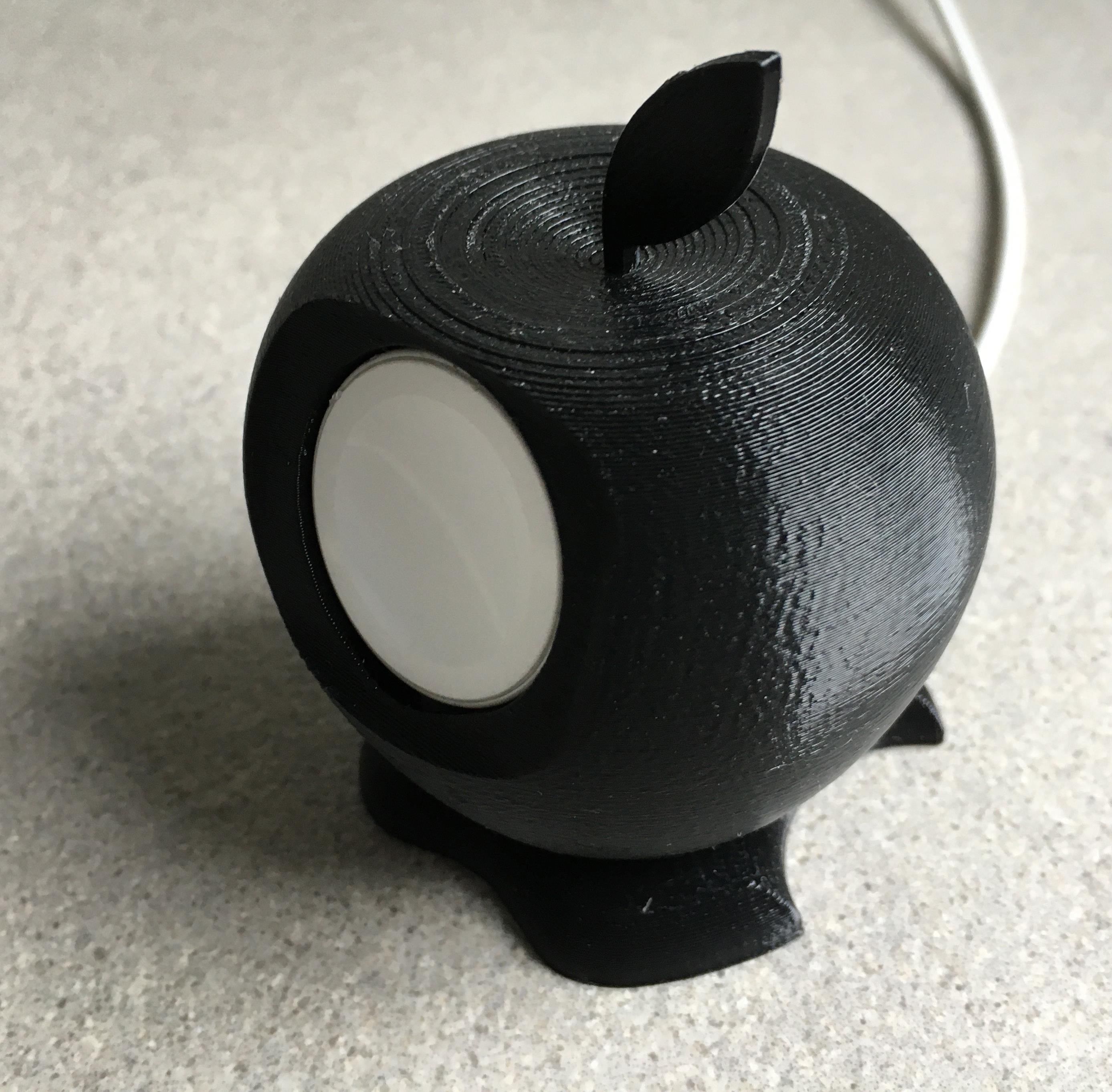 Soporte de carga para Apple Watch (40 mm) diseñado con la forma del logotipo de Apple. El cable pasa por el orificio y el cargador encaja en su sitio. El modelo tiene agujeros en la parte trasera para deslizar el cargador hacia fuera si es necesario.