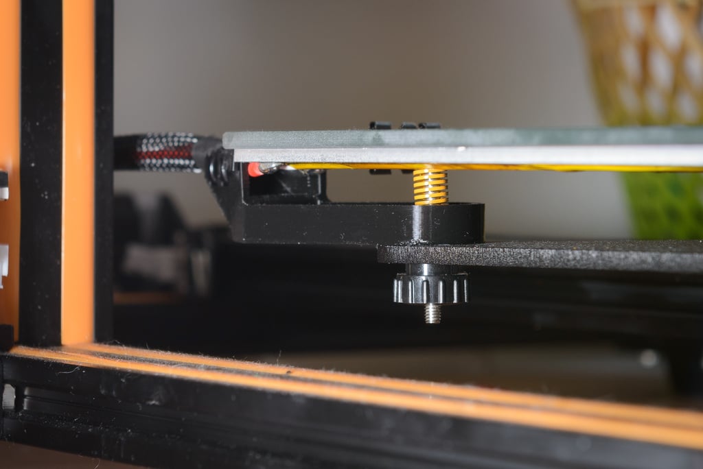 El soporte normalmente se monta en el tornillo izquierdo más exterior debajo del resorte y, para un acceso óptimo, puede ser necesario retirar la placa de vidrio de la cama de impresión. La construcción está diseñada para que no entre en contacto con la superficie caliente, lo que hace que sea seguro de usar con materiales de impresión comunes como el PLA.