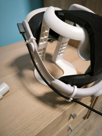 - Diseñado específicamente como soporte de cable USB-C para Meta Quest 3 en combinación con la correa para la cabeza KIWI Comfort Head Strap.