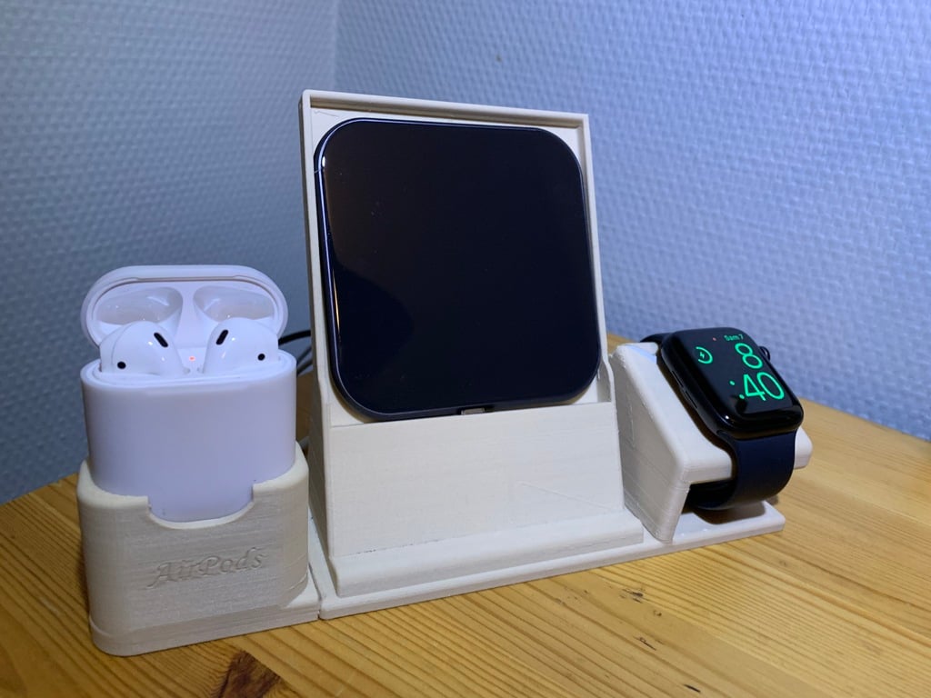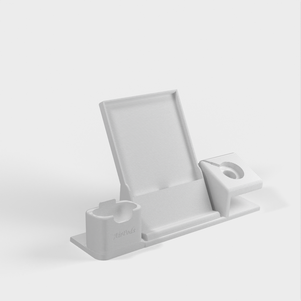 El soporte para reloj te permite ver siempre la hora mientras tu Apple Watch se está cargando y hace posible utilizar el reloj como alarma. El soporte para teléfono mantiene tu smartphone en posición vertical y la base para AirPods te permite cargar fácilmente tus AirPods. Esta base está diseñada para ser compatible con la mayoría de cargadores inalámbricos.
