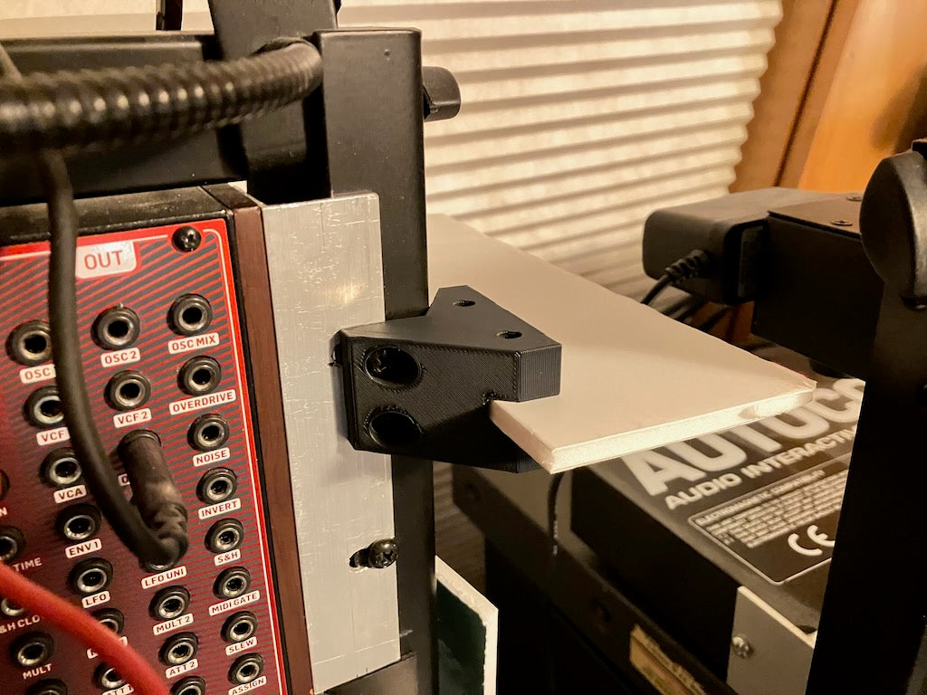 Para fijar su estante de material plano, puede utilizar pegamento, tornillos o simplemente taladrar orificios en el material según el patrón del soporte e insertar estacas de aproximadamente 5 mm como clavijas. La anchura de su material de estante debe ser alrededor de 428mm para un estante de 19', pero los estantes son notoriamente variables, así que mida después de haber instalado los soportes o corte más largo y recorte según sea necesario.