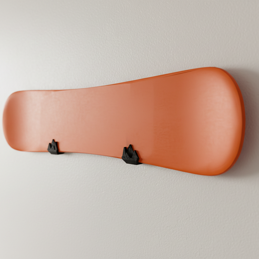 Suspensión oculta para snowboard. Este diseño avanzado permite sólo una fijación oculta, lo que hace que la instalación sea suave e invisible. La tabla de snowboard simplemente se coloca sobre la suspensión, después de lo cual la suspensión mantiene la tabla de snowboard en su lugar de manera efectiva y segura. Adecuado tanto para el hogar como para tiendas donde se expongan tablas de snowboard.