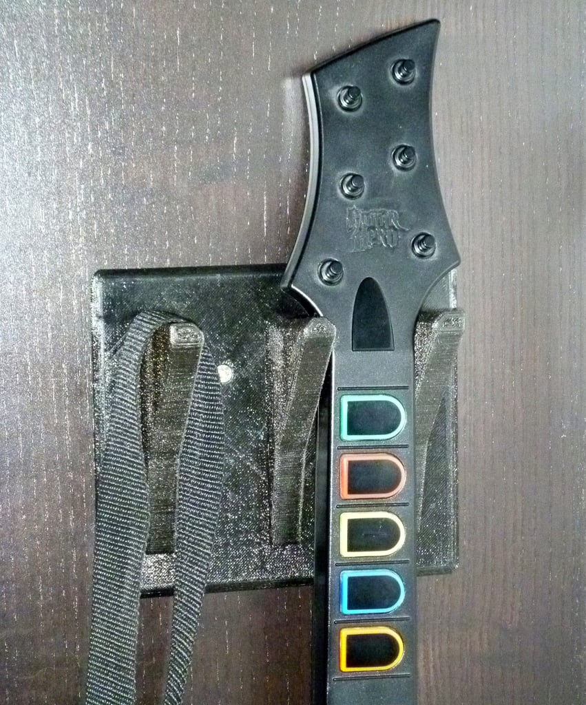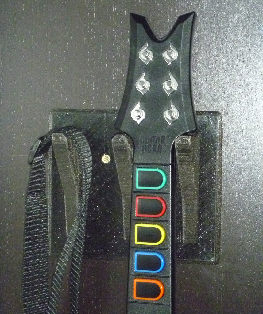 Soporte de pared para la guitarra de Guitar Hero con un gancho adicional para sujetar la correa. Este soporte está diseñado para que tu guitarra de Guitar Hero cuelgue de forma segura y práctica en la pared. El diseño simétrico lo hace adecuado tanto para jugadores diestros como zurdos.