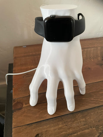 Soporte de reloj simple y elegante para un Apple Watch, diseñado como una mano. El cargador inalámbrico se puede colocar dentro de la mano y el montaje no requiere el uso de pegamento. Con este soporte, tu Apple Watch tendrá un lugar hermoso y práctico en tu mesita de noche, escritorio o donde quieras tenerlo.