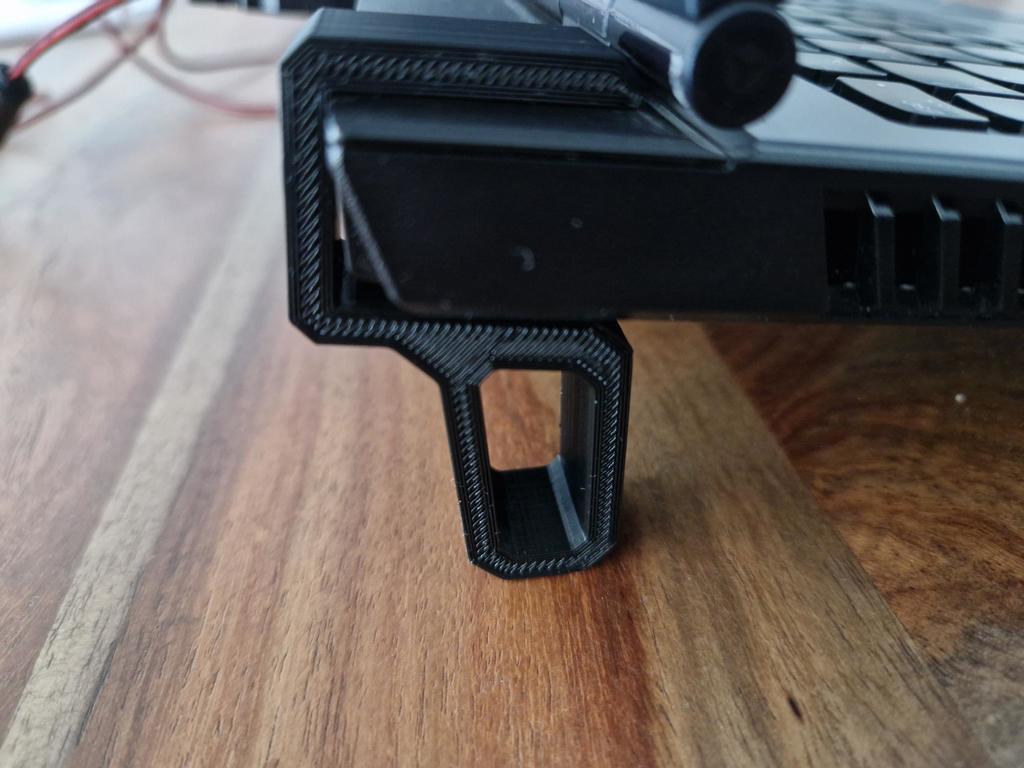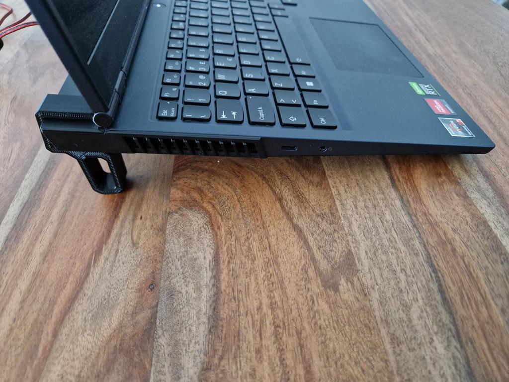 Soporte para portátil diseñado para Lenovo Legion 5. Levantando la parte trasera de tu portátil, puedes mejorar el flujo de aire del sistema de ventilación de tu portátil. Necesitarás imprimir un par de patas y también un par de gomas pequeñas para evitar que las patas se deslicen. Las patas deben colocarse en las esquinas de la parte trasera sin tapar las salidas de ventilación.
